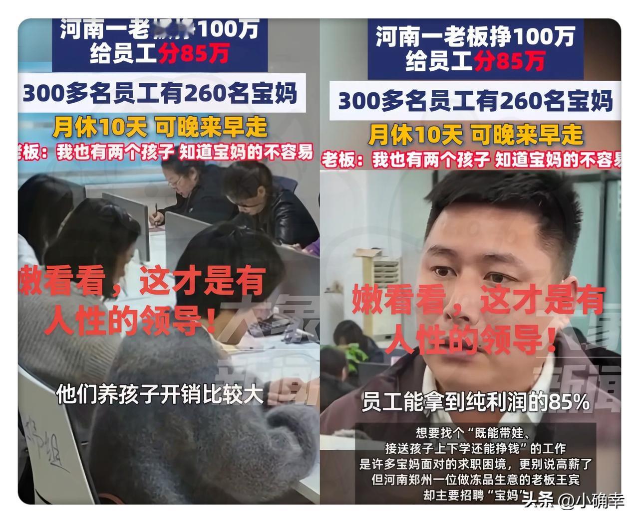 这下好了, 不仅河南,全国都知道了 河南郑州的一家做冻品生意的公司,300多名员工,竟然有260多人都是宝妈。 接送孩子能灵活上下班,每月除了固定休息还多给6天假,专门用来应付家长会、带娃出游,关键刚入职两三月月薪就上万,最高能拿5万,这福利谁看了不眼红? 其实这才是职场该有的样子——不是宝妈要平衡家庭和工作,而是企业该学会适配宝妈的需求。 老板自己有俩娃,懂职场妈妈的两难,这份共情比多少口号都管用。真正的人性化从不是施舍,而是承认妈妈们的价值,给她们兼顾生活的底气。 你们身边有这么神仙的公司吗?如果有这样的工作机会,你会果断冲吗?冻品生意 冻品批发店