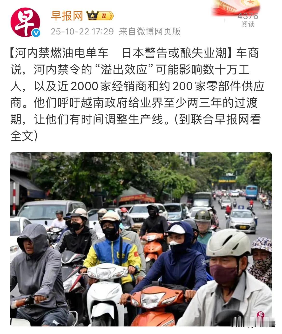 【越南一纸禁令让日本着急万分】 据外媒消息,越南计划在2026年禁止燃油摩托车进入河内,并且该举措范围将逐渐推向越南全国。 对于越南这一禁令,日本政府表达出极大的担忧,这将导致数千家日本企业和数十万工人失业。 日本政府显然开始着急,他们希望越南政府给一个缓冲期,至少需要两至三年。