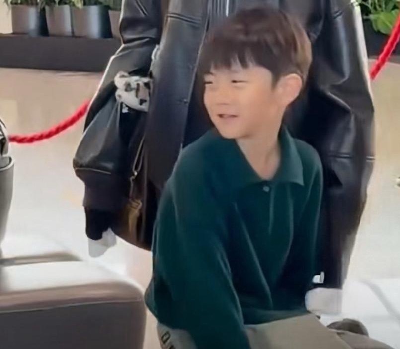 小儿子身穿绿色长袖polo衫,一头短发清爽利落,打造出既时尚又显眼的造型,让他的小眼睛也焕发出迷人的光彩。