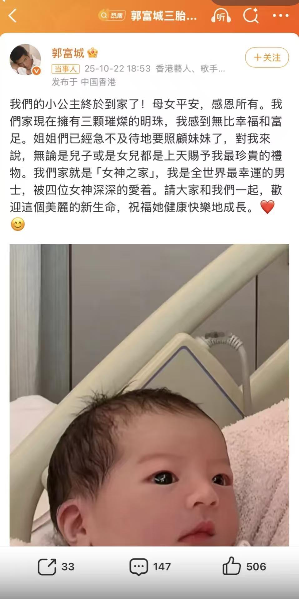 答案公布!郭富城第三天不是儿子,是一个小公主,郭天王亲自发文公布喜讯。 此前很