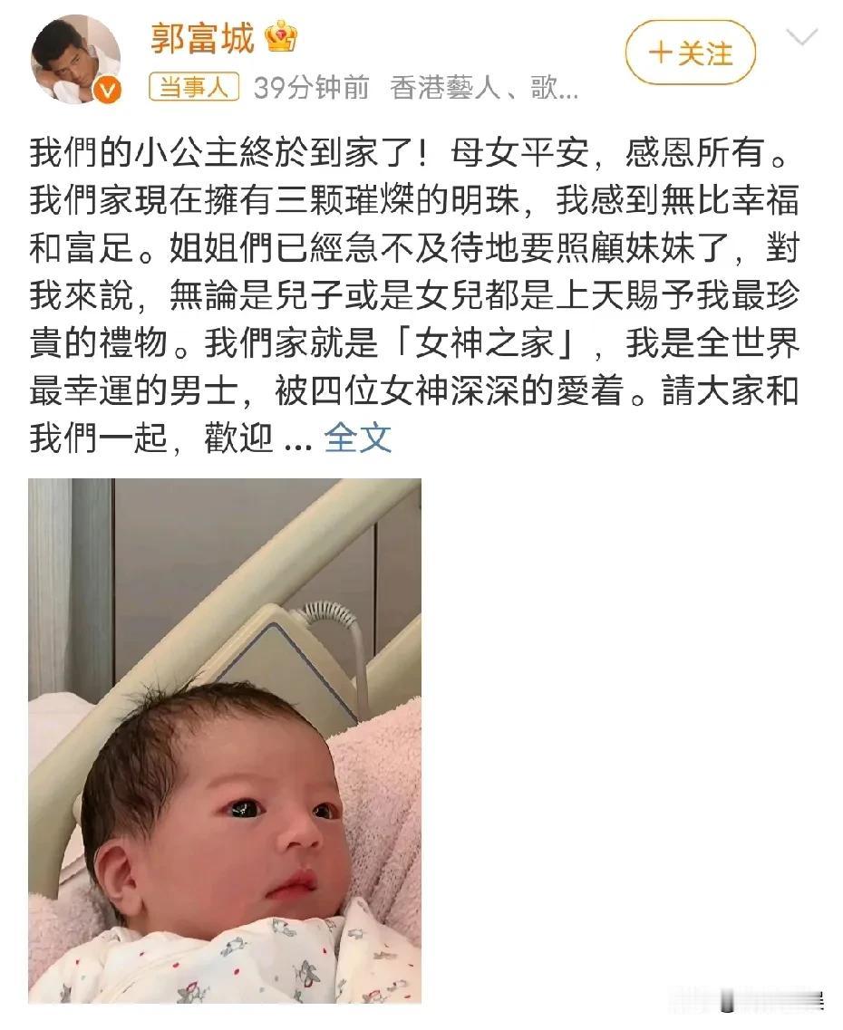 看到郭富城晒了自家三胎宝宝的照片,我才知道,要生一个漂亮的宝宝,父母颜值高有多重要,不论基因偏向谁,都是个大美人! 不信你瞧瞧林青霞,看看李嘉欣,还有蒋勤勤,都是超级女神,可是她们的孩子颜值都不高,可是再看看郭富城三个娃,都是美人坯子,清一色的大眼、高鼻、小脸蛋! 羡慕了啊,男女不重要,健康,漂亮才是最好。 祝福郭富城,六十岁再次荣当爸爸,又收获一个小美人!