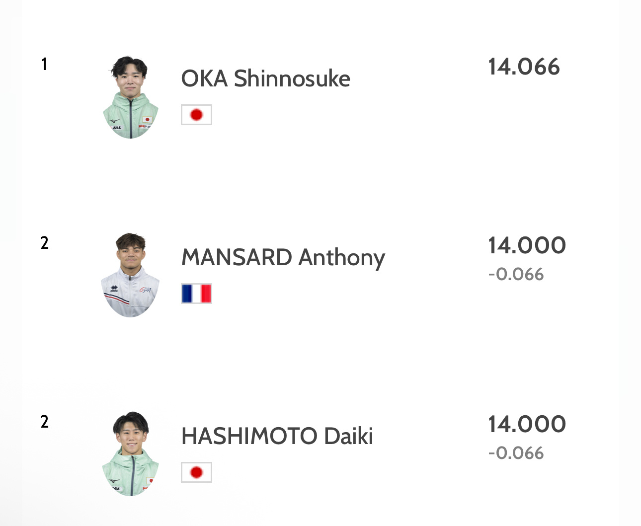 日本队冈慎之助 桥本大辉现在分列1.3位