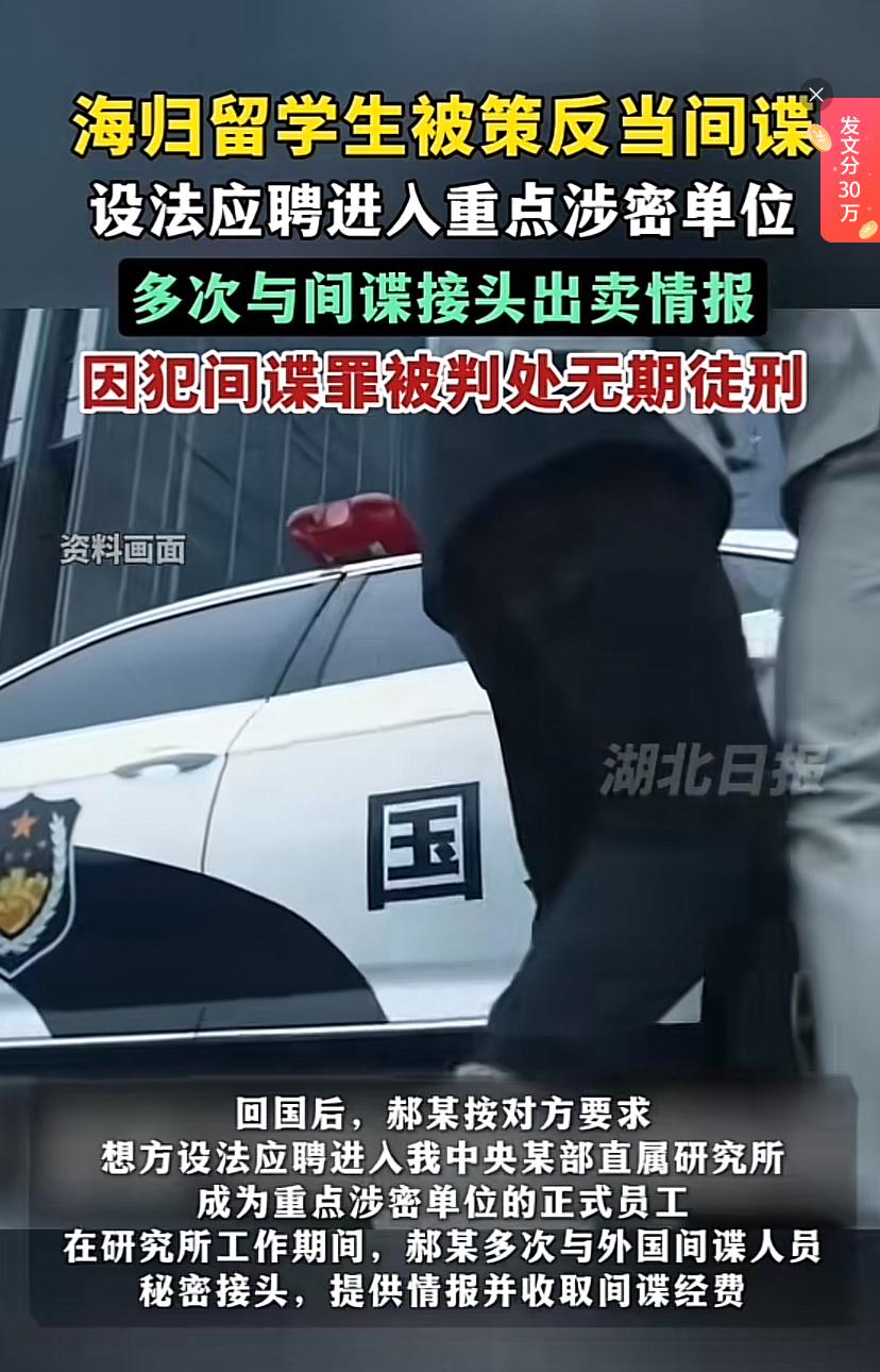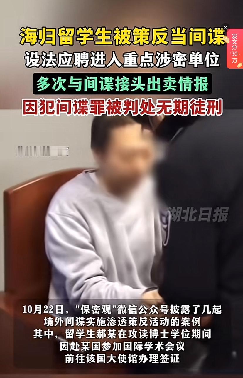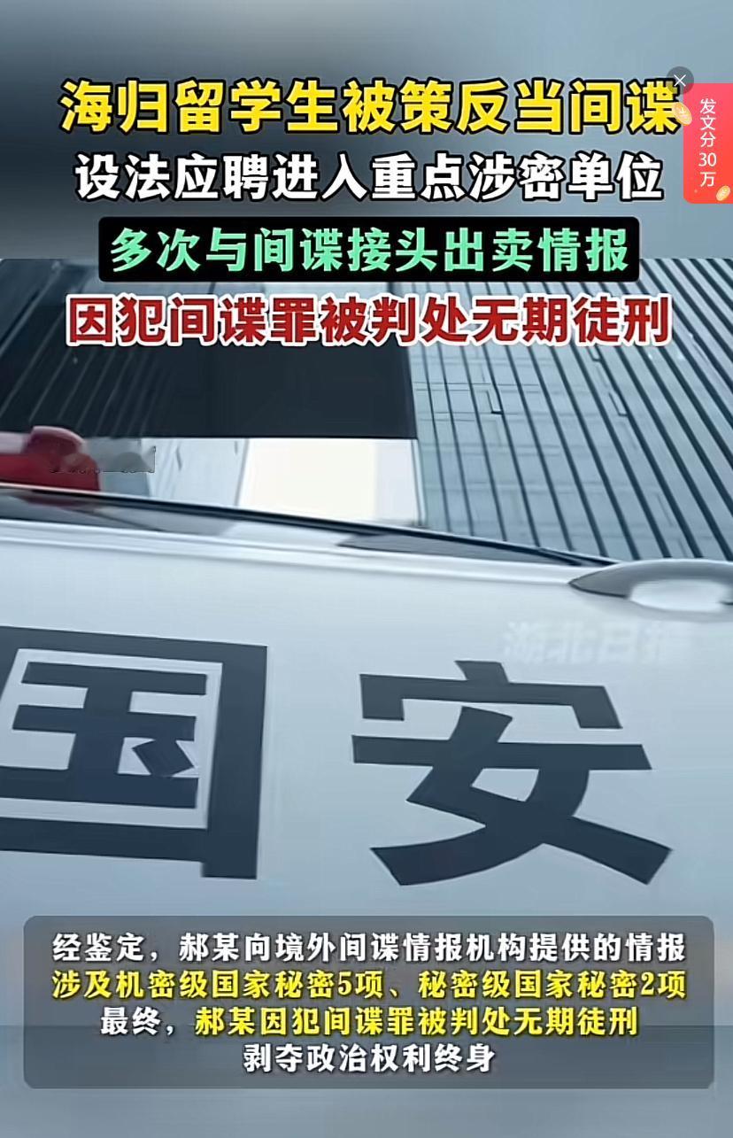 郝某出卖国家秘密被判处无期,这辈子只能在牢房好好反省了。郝某留学期间让间谍策反,回国后按照人家的步骤进入重点单位,上班期间给间谍提供情报。他这种行为就是明知故犯,没有可同情的地方,判无期已经算从轻发落了,不像有些人是进入人家圈套被拉下水。