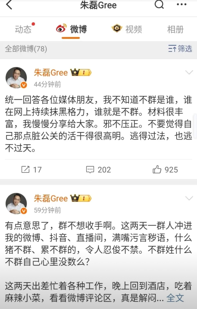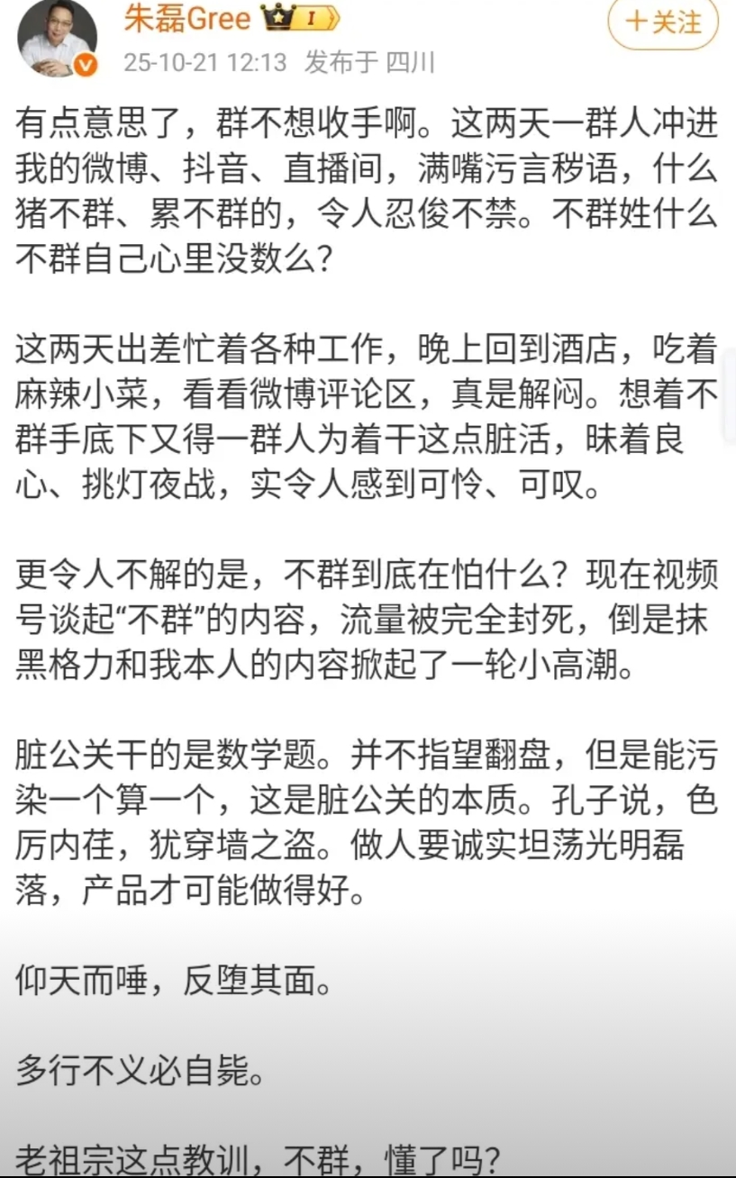 格力空调总监朱磊完全收不住了,发吐槽的博文是一条接一条!这不,10月21日中午,他又连发2条博文,第1条怒斥不群这两天指使一些人谩骂自己。第2条则表示谁在网上抹黑了格力谁就是不群!自己已经掌握了好多的材料,会慢慢透露出来的,要让仰天吐唾者自堕其面。