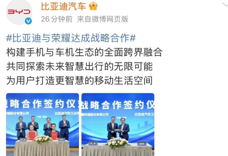 比亚迪:我们与荣耀达成战略合作! 就在刚才,比亚迪的社交官方账号放出了两张图片
