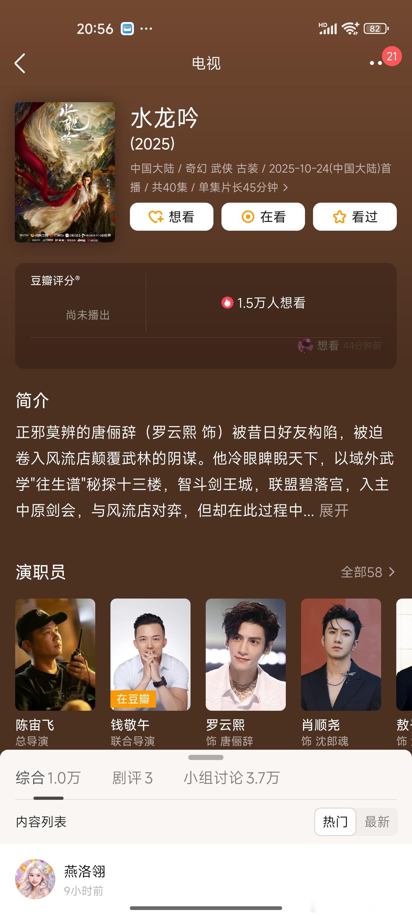 已经播出2天的龚俊《暗河传》豆瓣1.2万想看,10月24日即将播出的罗云熙《水龙吟》1.5万人想看、10月25日即将播出的成毅《天地剑心》5.5万人想看