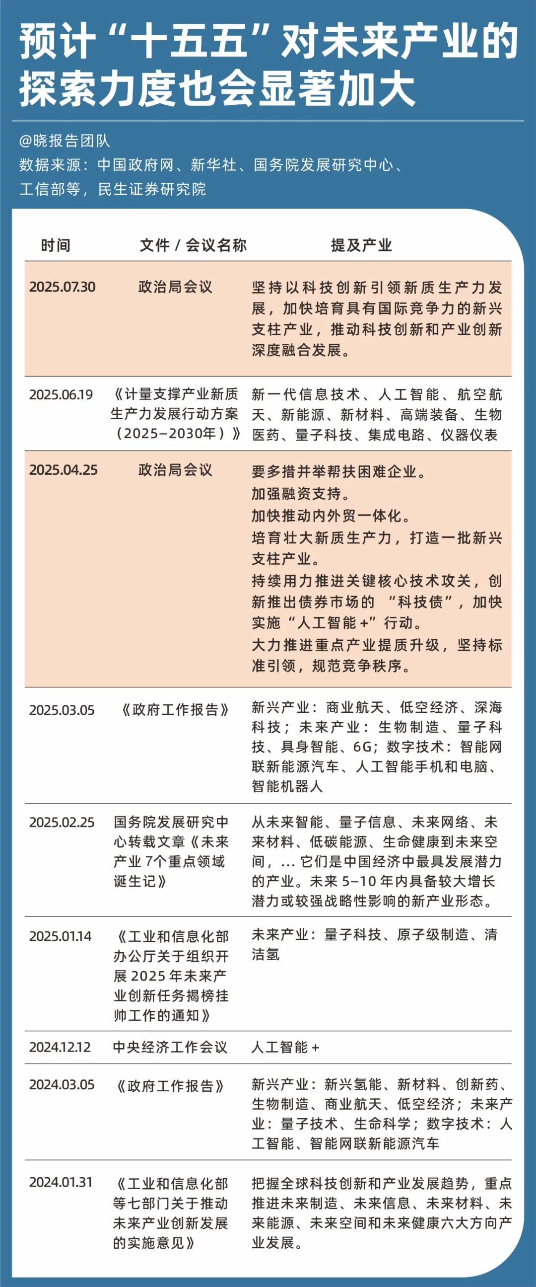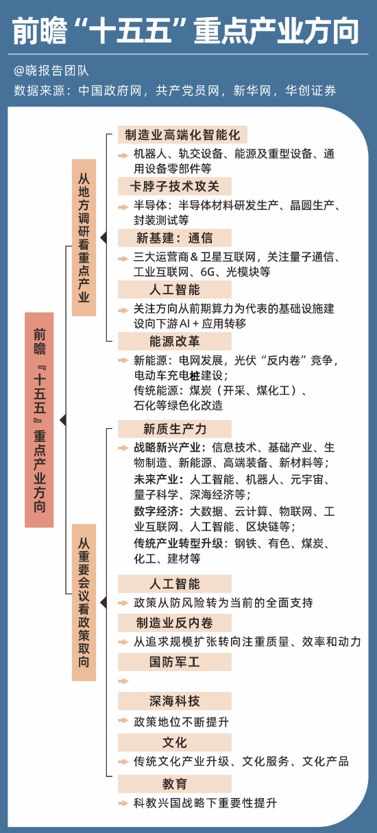 由于过去的五年计划编纂,往往会通过高层地方调研以及召开座谈会听取意见,因此可以从两个方面来推测“十五五”规划中可能出现的科技主线行业。