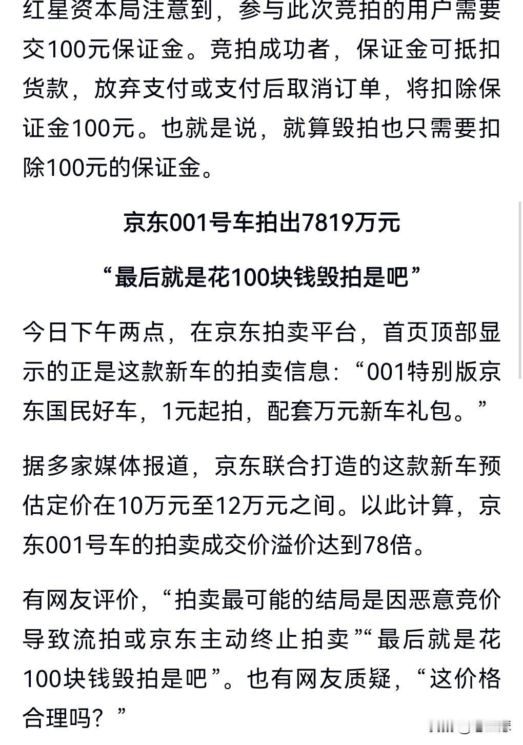 呵呵,这场拍卖也太不严肃了吧。 10月22日,京东001号车以7819万元拍出。 然而令人扯淡的是。 这么高的价钱随时可以毁拍,代价只需要扣除100元的保证金。 所以说拍出这么高的高价毫无意义。 因为最后的结局就是一个毁拍并扣除100元保证金的结果。