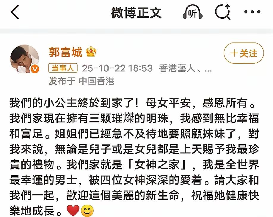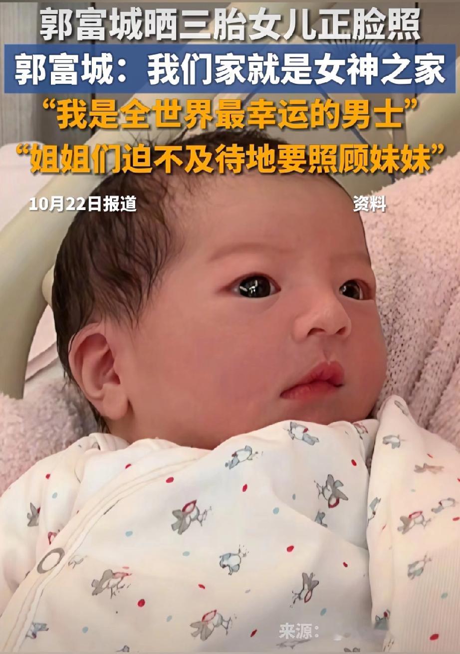 郭富城三胎来了,又是一个漂亮的小公主 以前外界都在议论郭富城想要一个儿子,但在个人看来郭富城真的是在顺其自然,生男生女都喜欢,不然按照郭富城的身家,想要一个儿子也是非常容易的事 对于三胎的到来,郭富城满心欢喜,亲自开车接女儿,方媛更是直接发文和郭富城真的是幸福的爱情