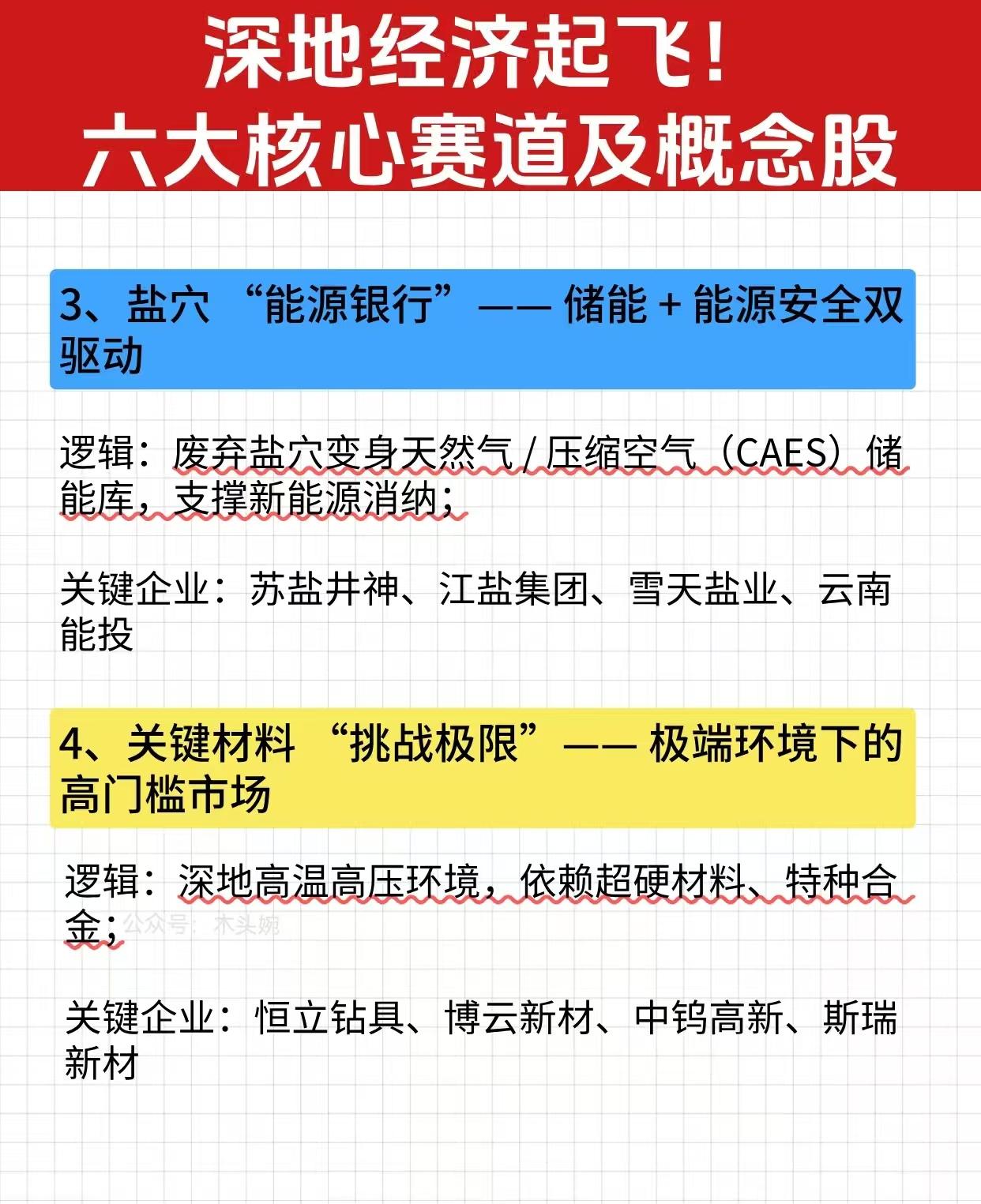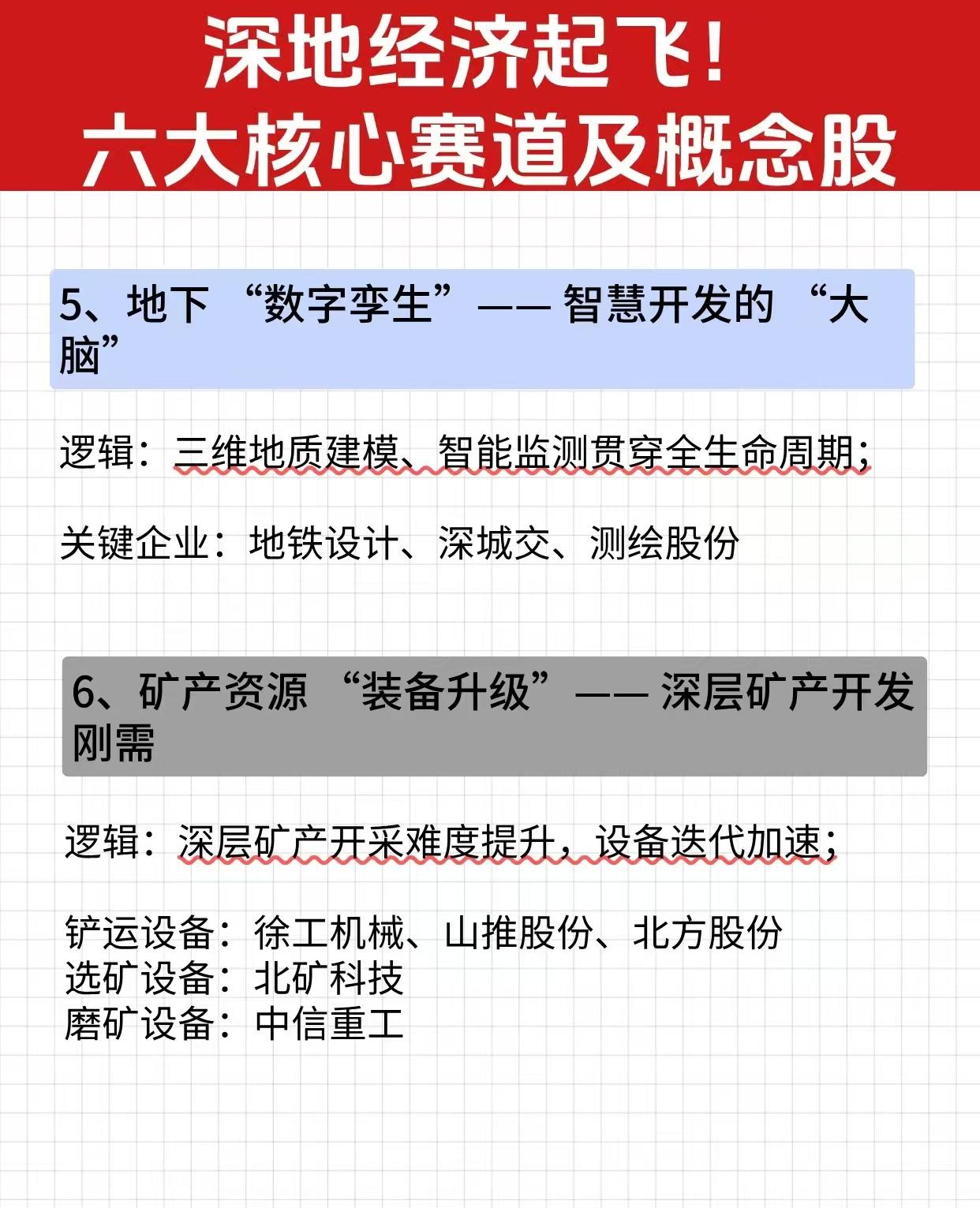 深地经济六大赛道核心龙头梳理 权威数据预计2030年全球深地经济规模将突破25万亿美元。我国“十五五”期间深地经济有望形成每年3-5万亿元的市场体量!国家已将深地资源勘探开发纳入战略性新兴产业规划,未来市场前景十分广阔。 深地经济概念直接起飞,相关概念六大核心赛梳理:勘探开发、地下空间、盐穴储能、关键材料、数字孪生、矿产装备升。 深地经济题材概念低位放量个股代表:海油工程、中海油服、贝肯能源、中国中铁、苏盐井神、江盐集团等等。 理财有风险入市需谨慎,资料取材网络仅供参考。深海经济概念股 深地经济 深地资源