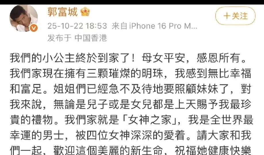 郭富城此刻估计有点失落吧!郭富城官宣三胎得女。儿子梦碎了! 在此之前,郭富城和妻子方媛已经先后生下两个小公主。 自从方媛在社交平台上公布三胎喜讯后,各种议论就没有断过。 有的网友说,方媛肚子里是儿子,郭富城甚至取消她的副卡限额,待遇比怀前2胎高得多。 有的网友说,郭富城打断了四大天王的岳父命,一举得男!从今往后,更有干劲了!因为偌大的家业有儿子继承了。 有的网友说:好心疼,天王儿子梦碎了! 其实要我说,也许人家根本没有在意到底是生儿子还是女儿,只要是自己的,儿子女儿都好! 你看从他发文就可以看出,对于这个老来女,他还是很喜欢的!正如他自己写的,无论是儿子还是女儿,都是上天赐予他最珍贵的宝贝!他是最幸运的男士,被4个女神爱着! 要我说啊,三个女儿也好,以后能带来3个儿子,就是不知道哪三个臭小子有福了! 话说回来,天王就是天王,基因真是没法说!你看这个刚出生的这个小宝宝真是漂亮啊!水汪汪的大眼睛,红扑扑的小脸蛋,让人一看就很喜欢。