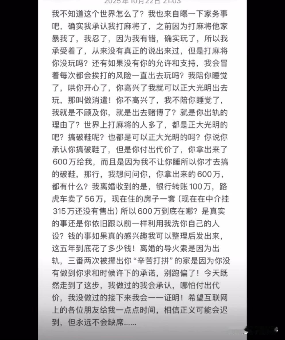 白雨因打麻将被老狗家暴,离婚因为老狗出轨! 白雨爆料出挨打监控,鼻孔穿血,多处淤伤,被打因为打麻将,我有错所以我受着,但是打麻将你没玩吗?如果没有你的允许和支持,我会冒着每次都会挨打的风险一直出去玩吗? 我陪你睡觉了,哄你开心了,你高兴了,我就可以正大光明出去玩。你不高兴,不陪你睡觉,就是不顾及你,就是出去赌博,这就是你出轨的理由吗? 你承认搞p鞋拿600万给我,是因为我不让你睡,所以你去搞破鞋。 我离婚收到银行转账100万,路虎车卖了56万,现在住的房子,中介挂315万还没有售出,所以600万到底在哪?你像以前一样利用我洗自己的人设,这5年到底花了多少钱,如果感兴趣我可以整理后发出来。 离婚的导火索因为出轨,三番两次被撵出你“辛苦打拼的家”,是因为你没有做到你求和时许下的承诺,相信正义可能会迟到,但永远不会缺席。