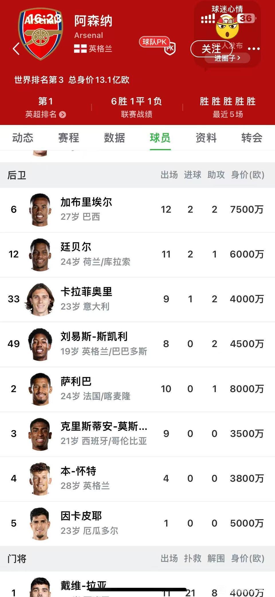 这个就是世界最强防线,阿森纳的后卫群。 昨天各大媒体都在吹嘘,拿数据说话场均0.25的丢球,确实目前防守最好。 只是身价都不高,24岁的萨利巴才8000万?皇马都愿意掏8000万,他不愿意去! 加布里埃尔第二高,才7500万。 我认为他们每个人都少了2000万身价。[偷笑]