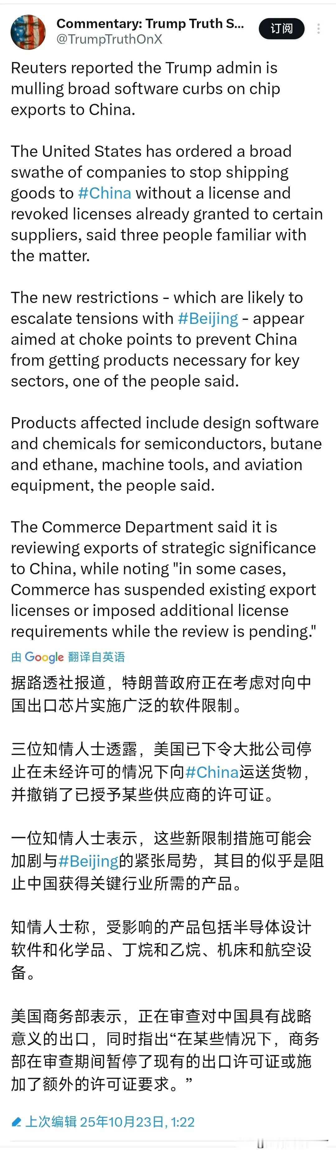 据路透社报道10月23日,特朗普政府正在考虑对向中方出口芯片实施广泛的软件限制。三位知情人士透露,美国已下令大批公司停止在未经许可的情况下向中方运送货物,并撤销了已授予某些供应商的许可证。 这哪是正常的贸易管控,分明是想卡住中方关键产业的脖子。受波及的远不止芯片设计软件,连化学品、丁烷和乙烷这类基础工业原料,还有机床、航空设备等高端制造领域的产品都被囊括在内。 美国商务部对此的回应倒是“官方”,只说在审查对中方有战略意义的出口,还轻描淡写提到“暂停部分许可证或加设要求”。这种遮遮掩掩的态度,反倒坐实了其打压中方产业的真实意图。 明眼人都能看穿其中的猫腻,特朗普政府这算盘打得隔着太平洋都能听见响。无非是盯上了我们的稀土资源,想靠卡住芯片软件、航空设备这些“刚需品”,逼我们在稀土管制上松口。 要知道,我们手握全球近90%的稀土分离提纯产能,从智能手机芯片到隐形战机材料,几乎没有高端制造能离得开稀土。美国自己的F-35战机,每架都得用掉近500公斤稀土材料,他们自然坐不住。 可他们真以为拿出口限制当筹码,我们就会乖乖就范?未免太低估我们的底气了。单看这些限制对美国企业的冲击,就知道特朗普政府是在“杀敌一千自损八百”。 中方每年要设计数百万种芯片,从消费电子到工业控制,全得靠这些软件干活。现在突然断供,美国软件公司失去的是一个每年以两位数增长的庞大市场,股价暴跌、利润缩水都是眼前的事。 之前5月美国就搞过一次芯片设计软件限制,结果不到两个月就被迫解除,不就是因为企业哭诉“损失太大扛不住”吗?这次重蹈覆辙,难道能有不一样的结局? 再看其他受影响的领域,美国的航空设备企业每年从中方市场赚走数百亿美元,波音公司的订单里近三分之一来自中方航空公司。机床领域,美国哈斯自动化在中方有十多个服务中心。 突然断供意味着之前的售后维护全成了空谈,客户迟早得转向德国、日本的品牌。丁烷、乙烷这些化学品更不用说,中方是全球最大的化工产品生产国,美国能源企业好不容易打开的中方市场,可能就此拱手让人。 这些美国企业花了十几年甚至几十年才在中方站稳脚跟,特朗普一句话就要把市场拱手让人,他们能甘心?资本是用脚投票的,真到了利润大跌的时候,企业游说团能把白宫的门槛踏平。 更可笑的是,这种“贸易禁运”式的操作,根本不符合全球产业链的现实。现在的产业链早就像一张密密麻麻的网,你中有我我中有你。美国的芯片设计软件需要我们的稀土做原材料,这种相互依存的关系不是靠行政命令就能切断的。 就拿芯片来说,一旦一方断供,整个全球芯片产业都会陷入停滞。去年美国搞芯片设备限制,结果全球芯片价格暴涨,美国本土的汽车企业因为缺芯被迫停产,这血淋淋的教训还没吸取够吗? 美国每年出口中方大豆超过3000万吨,玉米也有上千万吨,一旦加征关税,美国中西部的农场主又得哭着找政府要补贴。稀土管制再收紧一点,美国的芯片、新能源汽车产业都会面临“无米之炊”的困境,这种玉石俱焚的玩法,美国真的玩得起? 更关键的是,这种短视的霸凌行为,正在不断消耗美国的国家信誉。全球各国都在看着,美国今天能以“国家安全”为由限制中方,明天就能用同样的理由对付欧洲、日韩这些盟友。 之前美国就强迫韩国三星、SK海力士把芯片技术数据交给美国,让盟友寒了心。现在又搞大范围出口限制,只会让更多国家加速推进“去美国化”供应链,美国想靠技术霸权维持霸权的日子,只会越来越难。 “无国界记者”组织曾批评特朗普政府的政策“制造不信任氛围”,放在贸易领域更是如此。中美作为全球前两大经济体,合则两利斗则俱伤。全球经济刚从疫情中缓过来,需要的是合作共赢,而不是阵营对抗。 特朗普政府这种为了一己私利,不惜破坏全球产业链的做法,不仅会加剧中美关系的紧张,还会拖累全球经济的复苏步伐。说到底,特朗普政府的这种操作,本质上是霸权思维在作祟,以为靠技术优势就能压制住我们。 可他们忽略了我们的韧性和创新能力,这些年我们在芯片设计软件、高端机床等领域一直在加速突破,虽然现在还依赖进口,但假以时日必然能实现自主可控。到时候美国再想把技术当筹码,恐怕只能是一厢情愿。 特朗普大概还在做着“极限施压逼我们让步”的美梦,却没意识到自己正在往坑里跳。企业的不满、盟友的疑虑每一项都可能成为压垮骆驼的稻草。真到了企业集体反对、全球产业链动荡的时候,他恐怕只能自己吞下苦果。 毕竟,在全球化的今天,搞单边主义、霸凌行径,注定是死路一条。