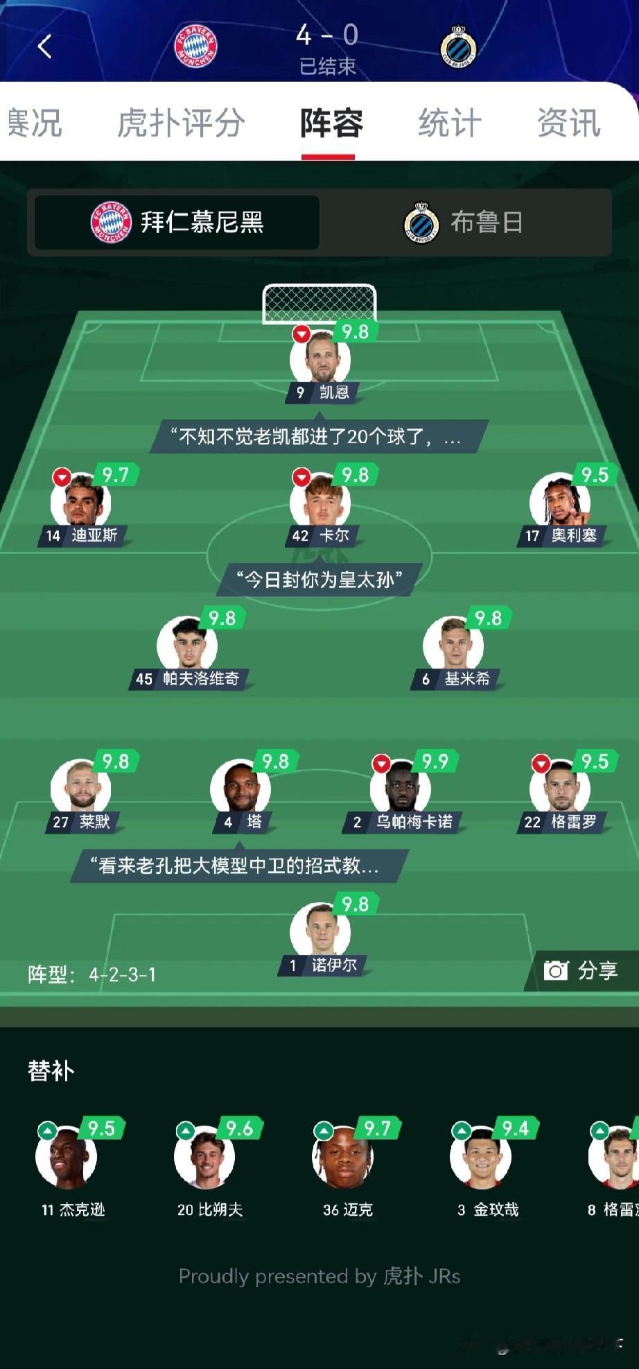 拜神不如拜仁!各项赛事12连胜!我就问还有谁能阻挡这支拜仁?下面和巴黎的大战,才是孔帕尼今年真正的第一次大考。 其实这场拜仁下半场收着踢了,而且运气差点,不然布鲁日绝对要喝七喜的。 孔帕尼又是一场把手里的牌用到极致的比赛。不仅尝试了双逆足边后卫,还让凯恩和乌帕早早打卡下班,卡尔和杰克逊收获进球,连迪亚斯都终于不再连轴转了。确实是少帅有能! 看来今年的德甲就靠拜仁和多特挣分了,药厂和法兰克福什么玩意,主场都敢惨败。