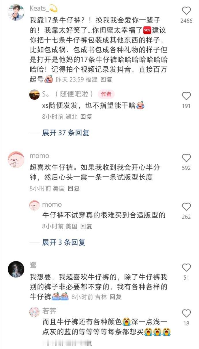 天啊!17条牛仔裤的礼物,我要是po主闺蜜我晚上都笑得睡不着了