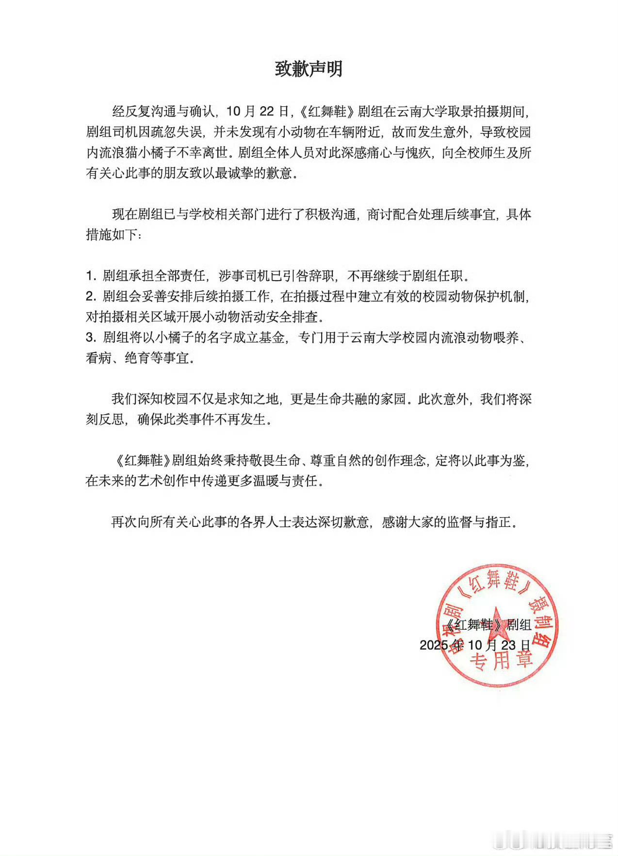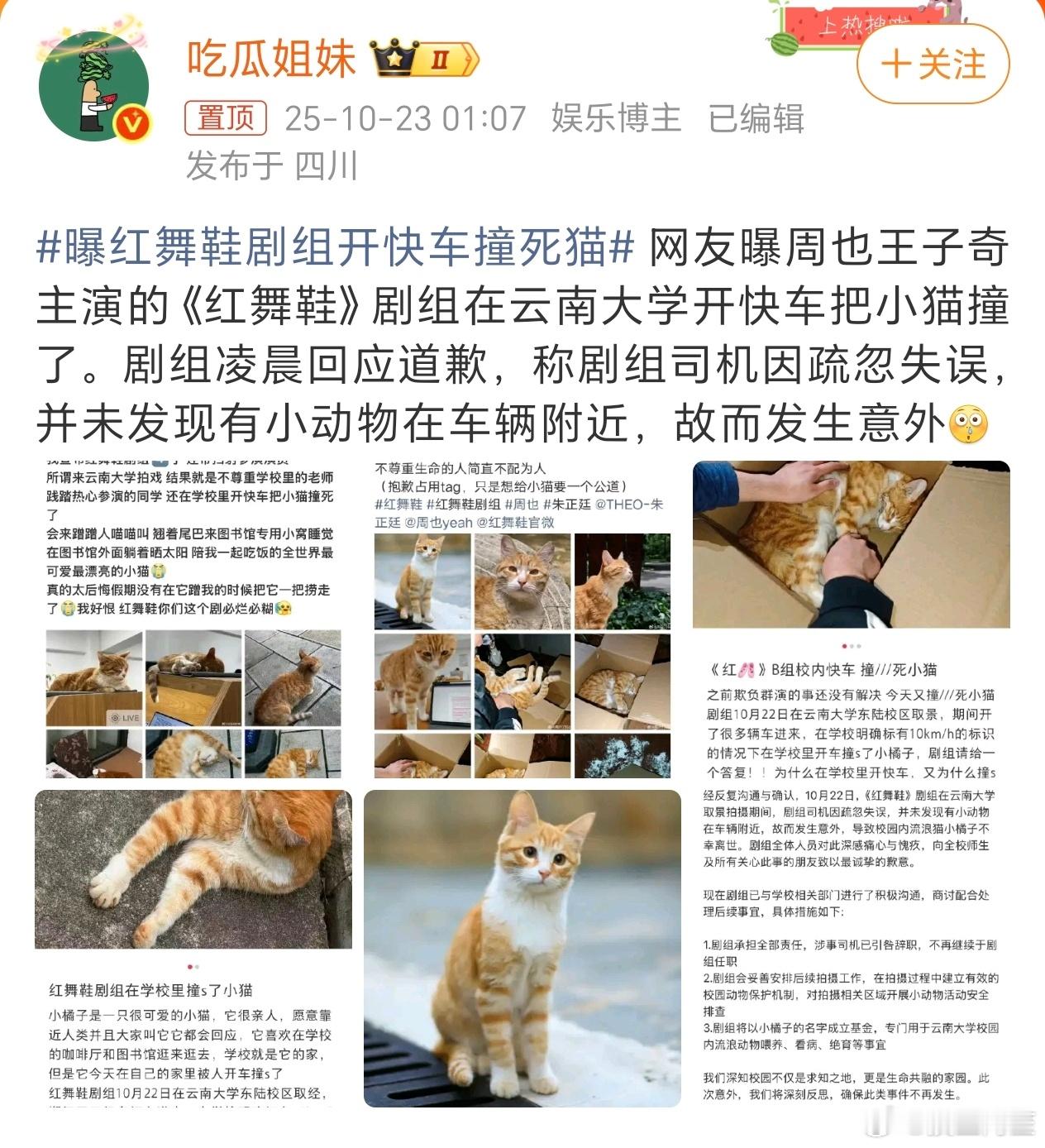 剧组承认并且道歉了……真的好好反省一下吧,如果在校园里开车的速度能快到把灵敏的小猫撞死,那如果是人的话更跑不了了……这小猫属于是替人受过了。曝红舞鞋剧组开快车撞死猫