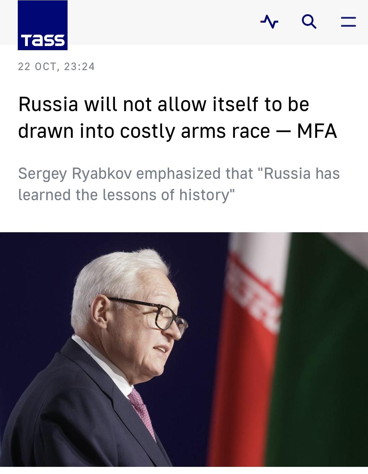 塔斯社:俄外交部称”不会让自己卷入代价高昂的军备竞赛” 塔斯社莫斯科10月22日电:俄罗斯外交部副部长谢尔盖·里亚布科夫表示,俄罗斯不会让自己陷入代价高昂的军备竞赛。 报道说,他在题为“俄罗斯核政策的历史与现状以及核领域的公共外交”的网络研讨会系列的一场会议上表示,”我们不会让自己陷入一场代价高昂的军备竞赛”。系列会议由能源与安全中心在总统基金会的支持下组织。 这位资深外交官强调,“俄罗斯已经吸取了历史的教训”,”不会再落入这样的陷阱”。里亚布科夫指出,”有一点我们非常清楚:我们拥有在任何时候保护自己和推进我们利益的能力和资源”(The senior diplomat emphasized that “Russia has learned the lessons of history.” “No more such traps,” Ryabkov noted. “One thing we know for sure: we have the capabilities and resources to protect ourselves and advance our interests at all times.”)。 报道的原标题是《Russia will not allow itself to be drawn into costly arms race — MFA》(俄外交部:俄罗斯不会让自己卷入代价高昂的军备竞赛)。