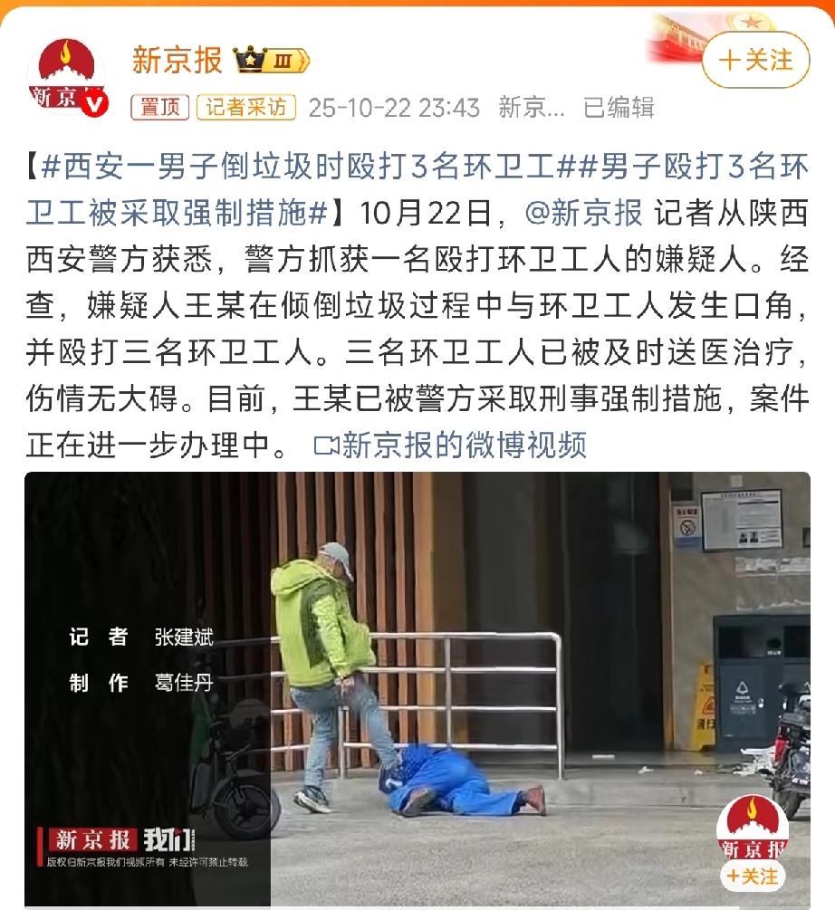 西安打人男子被刑拘!环卫工尊严岂能任人践踏 这事儿发生在10月22日西安街头,一名男子倒垃圾时和环卫工起冲突,竟直接动手殴打三名环卫工人,甚至追着倒地的人猛踢头部。 目前打人者已被警方刑事拘留,但视频里环卫工蜷缩着不还手的画面,实在让人揪心。 表面看是个人冲动,可仔细一想,环卫工被轻视不是一天两天了。超九成是临时工,没社保、常欠薪,去年西安还有300多人因五个月没发工资堵路维权。平时喊“城市美容师”,真遇到事却成了软柿子。 好在这次警方用了刑事手段而非简单行政处罚,算是个进步。 但光靠严惩不够,得从根上改:外包公司必须签合同缴社保,那种“以克论净”的苛刻考核也该取消。 咱们普通人能做的,就是扔垃圾时多走两步,见到不公出声支援——尊重不是节日口号,是日常行动。 暴力循环必须终结。城市的体面,不该建立在弱势群体的隐忍之上。