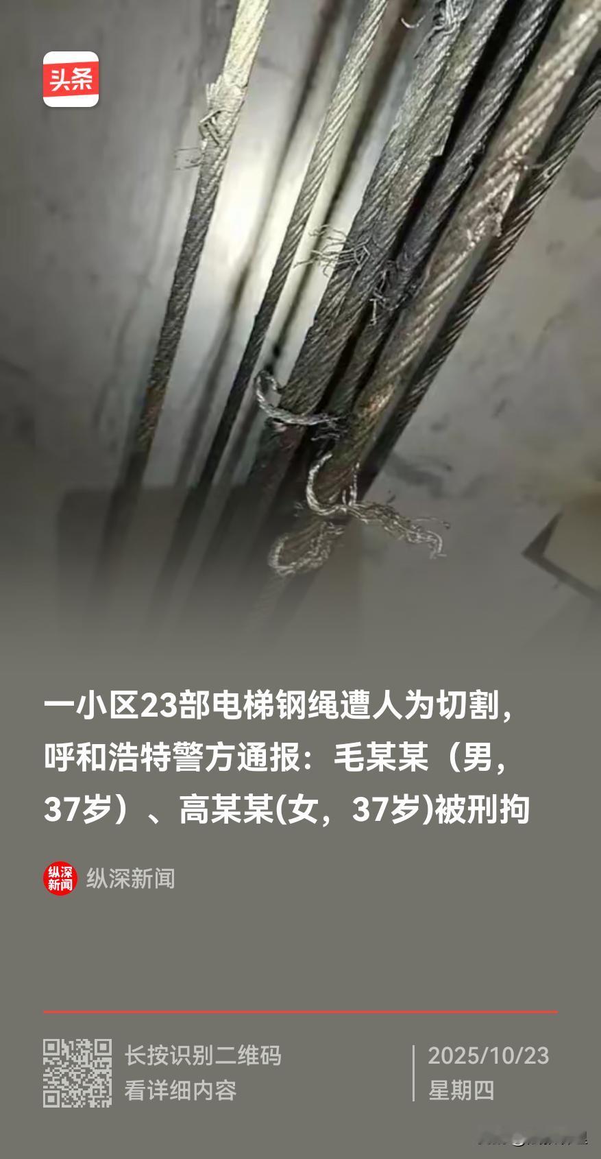 小区23部电梯钢绳被割!两人被刑拘物业回应高楼电梯损坏业主爬楼 涉嫌“以危险方法危害公共安全罪”!太坏了[炸弹][炸弹][炸弹] 呼和浩特祥瑞家园小区的业主们至今心有余悸——50部电梯里,23部的承重钢绳被人恶意切割,若不是检修人员日常巡检发现,一旦有人乘坐,后果就是轿厢坠落的惨剧。如今两名嫌疑人被刑拘,案件的关键法律定性浮出水面:他们涉嫌的不是简单的“故意毁坏财物罪”,而是更严重的“以危险方法危害公共安全罪”。 要搞懂这个罪名,得先看《刑法》的核心规定:以与放火、决水、爆炸等危险性相当的方法,危害不特定多数人的生命、健康或重大财产安全,就可能构成此罪。最高法的典型案例(如付某见驾车冲撞人群案)更明确,判断的关键是“行为危险性是否与放火、爆炸相当”“危害公共安全”。 回到这起电梯案,嫌疑人的行为完全符合这两个核心要件。首先,电梯承重钢绳是核心安全部件,一旦被切断,运行时必然引发坠落,这种对“公共设施关键部位”的破坏,和在人群密集处放火、私设电网的危险性相当——每一部受损电梯都可能成为“夺命陷阱”。其次,小区电梯是业主日常出行的必备工具,使用人群涵盖老人、孩子、上班族,属于“不特定多数人”,嫌疑人明知电梯会被多人使用,仍大范围破坏,主观上放任公共安全受危害的结果,这正是此罪要求的“故意”。 有人可能疑惑:为什么不定“故意毁坏财物罪”?要知道,故意毁坏财物罪侧重“破坏财产”,而此案中,嫌疑人的行为本质是“通过破坏设施威胁他人生命”,危害的是公共安全,而非单纯的财产损失。就像最高法在类似案例中强调的,当行为同时危害财产和公共安全时,要优先认定危害公共安全类罪名——毕竟人的生命安全,永远比电梯的维修费用更重要。 如今两名嫌疑人已被刑拘,等待他们的将是法律的严惩。根据《刑法》,此罪未造成严重后果的,可处3到10年有期徒刑;若造成重伤、死亡,最高可判死刑。这起案件也给所有人提了醒:对小区电梯、燃气管道等公共设施的破坏,从来不是“小事”,而是触碰法律红线的重罪——因为每一次对公共安全的漠视,都可能让无辜者付出生命的代价。电梯伤人 老人割断安全绳 电梯坠落 电梯钢缆 电梯安装纠纷 电梯老旧小区