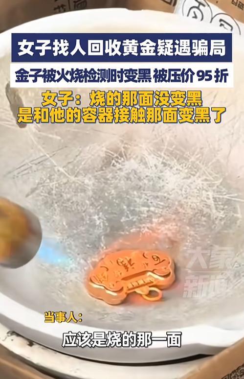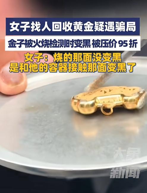 “防不胜防!”10月21日,四川成都,一女子找人回收黄金首饰疑似被做局,回收商家用火烧后金饰背面开始发黑,他称金子有杂质只能95折收,女子心生疑虑就没卖,网友:要是真不纯他根本不会收! 金价攀高,很多人都想趁机将自己手中的黄金变现,但是找人回收黄金时可一定要小心谨慎,别最后被人卖了还帮人数钱! 一女子见金价暴涨,便将自己的金吊坠送去回收,回收商家当着女子的面用火烧这些金首饰,没想到吊坠经过火烧后局部开始发黑。 回收商家见状,先是询问金子在哪买的,随后告诉女子这金吊坠不纯,自己只能95折帮忙收,女子有些不敢相信,将发黑的吊坠拿起来仔细查看。 只见金吊坠正面完好,只有背面发黑,可女子记得商家用火烧的是正面,当时这个金吊坠的背面紧贴着商家的容器,她感觉容器可能有点问题。 女子感觉事有蹊跷,想了想还是没有将金首饰卖给这个回收商家,她怀疑自己被做局,将这段回收经历分享到了网上。 不少网友认为如果黄金真的不纯,商家压根就不回收,有人提出有可能是商家的容器和手上都沾有洗洁精,洗洁精接触金子后再经过火烧就会发黑,不管真相如何,回收黄金时一定要选择靠谱的商家,小心谨慎些总没错! 信息来源:《女子找人回收黄金疑遇骗局,金子被火烧检测时变黑,被压价95折》大象新闻