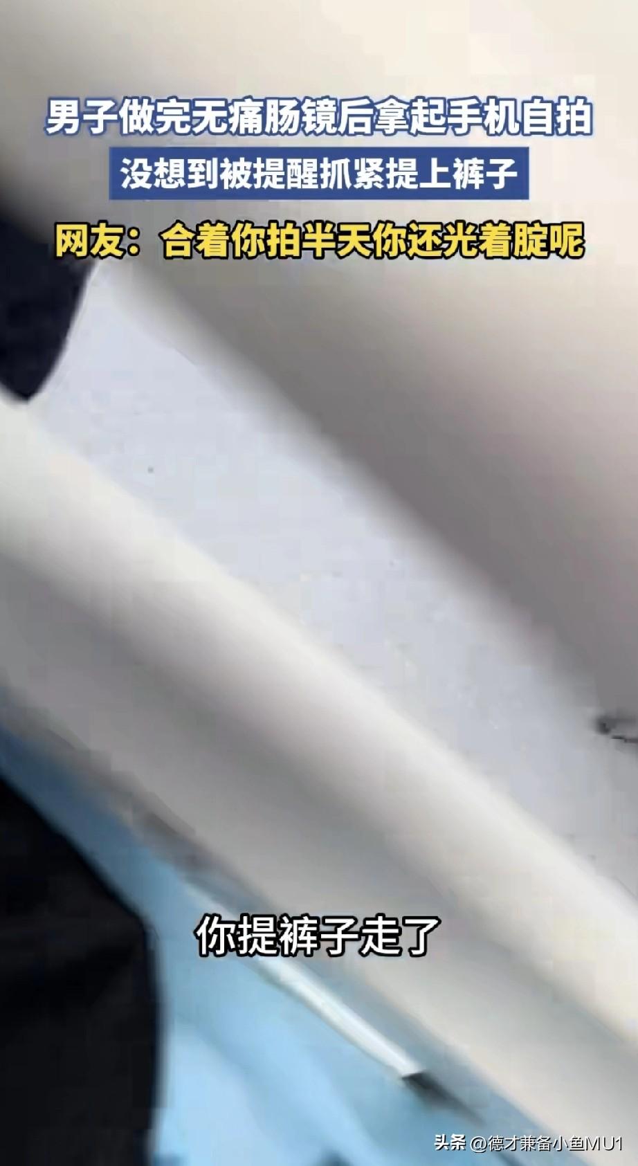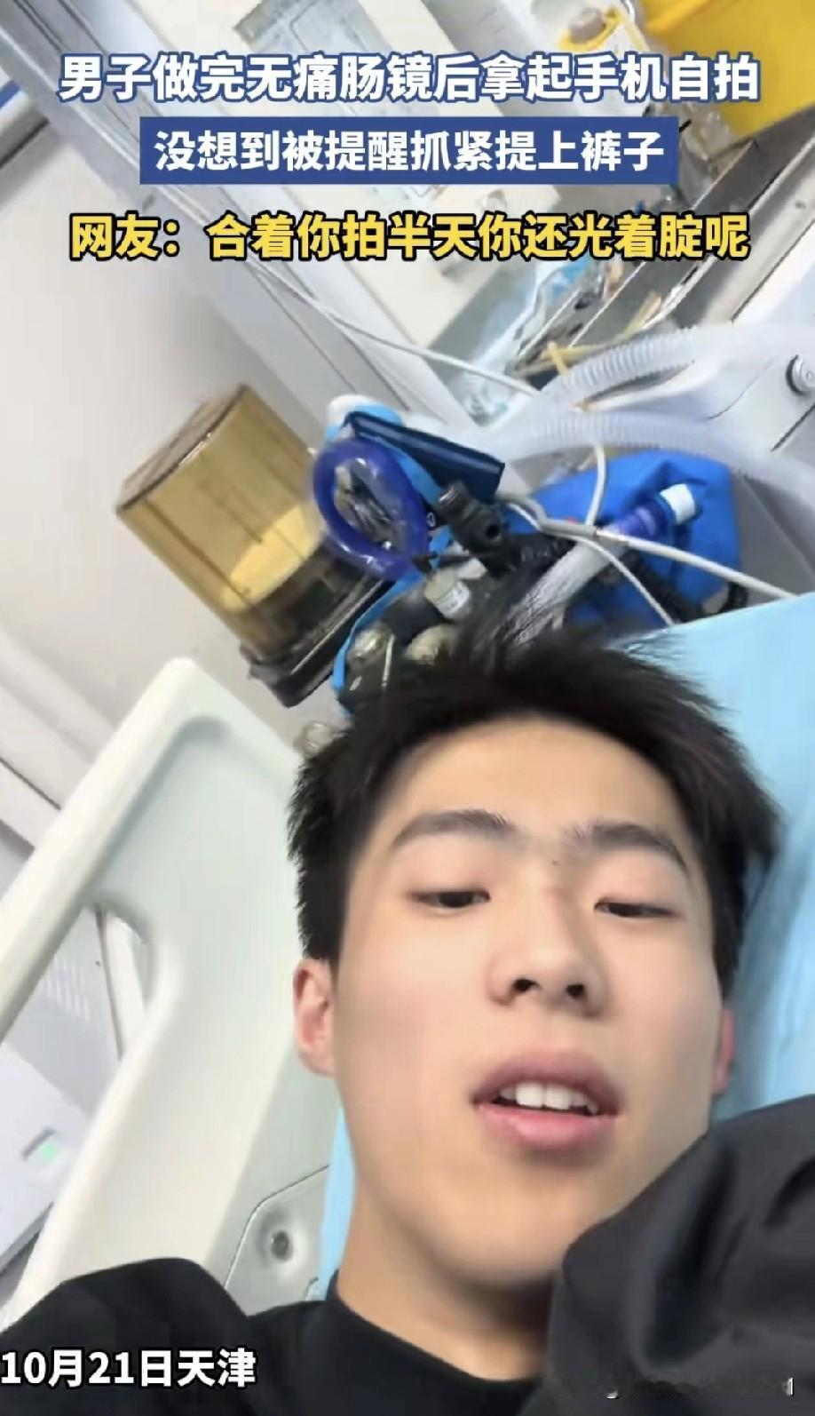 天津有个小伙子去医院做无痛肠镜检查,麻醉药效刚过,迷迷糊糊的他便拿起手机自拍,还叫嚷着“天都塌了”。这时,旁边的护士提醒道:“帅哥,别玩手机啦,赶紧提上裤子就能走了。”小伙子这才回过神来,自己拍了半天照,裤子都没提,还躺在病床上,尴尬至极。他赶忙放下手机,提上裤子。 说实话,在医院做完无痛肠镜被推出来的人,都是露着半个屁股,根本没人会帮你提裤子。做过肠镜的人,你们遇到的也是这种情况吗?我最近肠道老是不舒服,还便秘,也想去检查一下。 但害怕,害羞,怎么办啊?