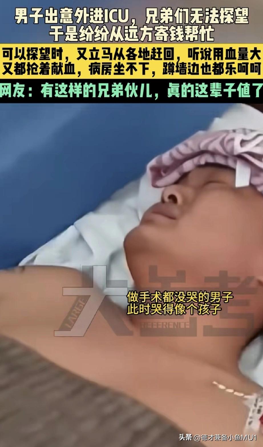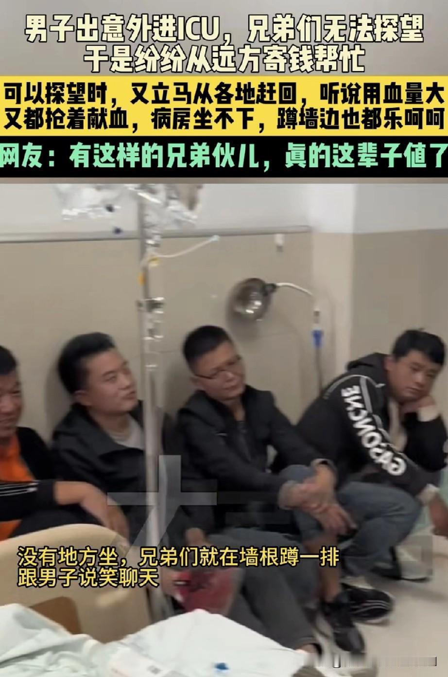 河南郑州有一男子遭遇意外住进了 ICU,他的好兄弟们无法前往探望,便纷纷寄钱相助。得知男子病情好转,转入普通病房可以探望时,他们立刻从四面八方赶来。一进屋,他们放下东西,赶忙走上前去握住男子的手嘘寒问暖。男子做手术时都没哭,可看到从各地赶来的好兄弟,却像个孩子一样哭了。 好兄弟们听闻大夫说男子用血量大,都争着献血,病房里坐不下,大家就蹲在墙边,乐呵呵地和男子聊天。 兄弟情深,一辈子的情谊!这哥们原本好好的,你们一下子来了这么多人,估计把他吓得够呛,都哭了。 大哥人缘真好,一个人身边有三五个知己就已十分难得,他竟有这么多! 大概率是战友。发小和同学,一般很难有如此深厚的情谊。即便高中及以下同学时期,你舍得花钱,打架时能独当一面保护大家,想有这样的好朋友也难如登天。大学同学能处到这种关系,概率更是微乎其微。 网友说这人要么有能力,要么有家世。这世界就是如此,若仅靠人缘好就能处好关系,那些老实善良的人也不会过得那么惨。说实话,我帮过很多人,不管是大忙还是小忙,甚至还救过别人的命,可现实中人家和你交往,一看家世,二看能力,若两者皆无,人家只会客气一下,根本进不了人家的朋友圈。记住,这世上只有能交换利益的人才有自己的圈子。 对此大家怎么看?
