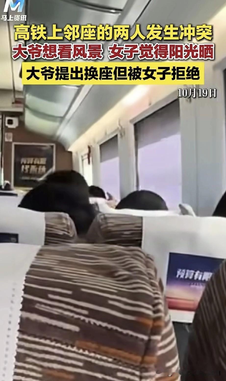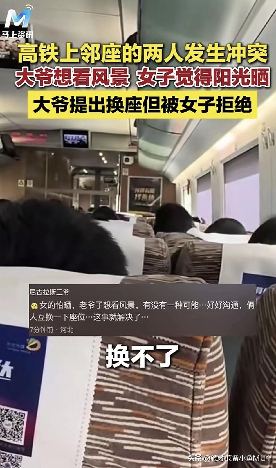 高铁上,邻座的大爷和小姑娘起了冲突。小姑娘因太阳太晒,拉下了窗帘,可大爷想看风景,便不让她拉。小姑娘刚把窗帘拉下,大爷就又拉上去。随后,大爷提出和小姑娘换座,然而小姑娘不同意,换座之事也就无法达成。所有车窗都拉着窗帘,显然是太阳晒得人难受。此时,大爷有些不讲道理了。 我最讨厌坐车时遇到这种自以为是的人。老实人往往只能强忍着,不敢吭声;不老实的,就会像视频里那样,从争吵演变成斗殴。反正忍也不是,不忍也不是。忍了,自己心里窝火难受;不忍,大家都不好受。但凡和善点,又怕晒又不看风景,大爷提出换下位置,百分之九十多的人都会答应的。 有些人就是如此自私自利,一点小事就不依不饶。出门在外,不懂得调节自己,总想着让别人顺从自己的喜好……车是把你送到目的地的,又不是专门拉着你旅游的。靠窗的人连这点话语权都没有了吗?要是刮风下雨影响到靠窗的人,人家是不是也得把窗帘拉下来呢?