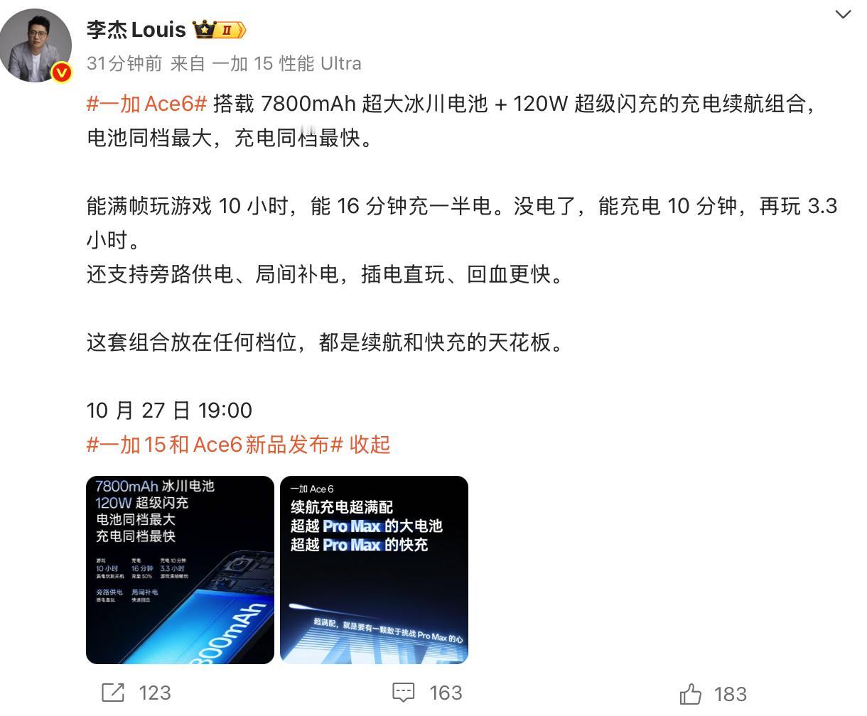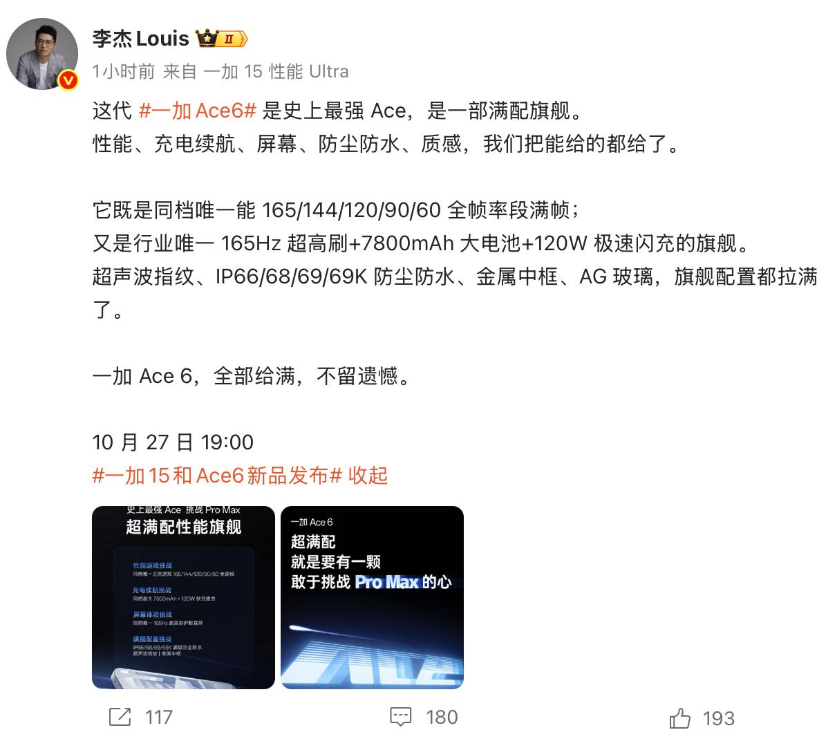 一加Ace6 骁龙 8 至尊版+全新「风驰游戏内核」 165Hz 超高刷 7800mAh 电池+120W快充 IP66/68/69/69K 防尘防水 超声波指纹+金属中框+AG 玻璃 3000-4000元价位段