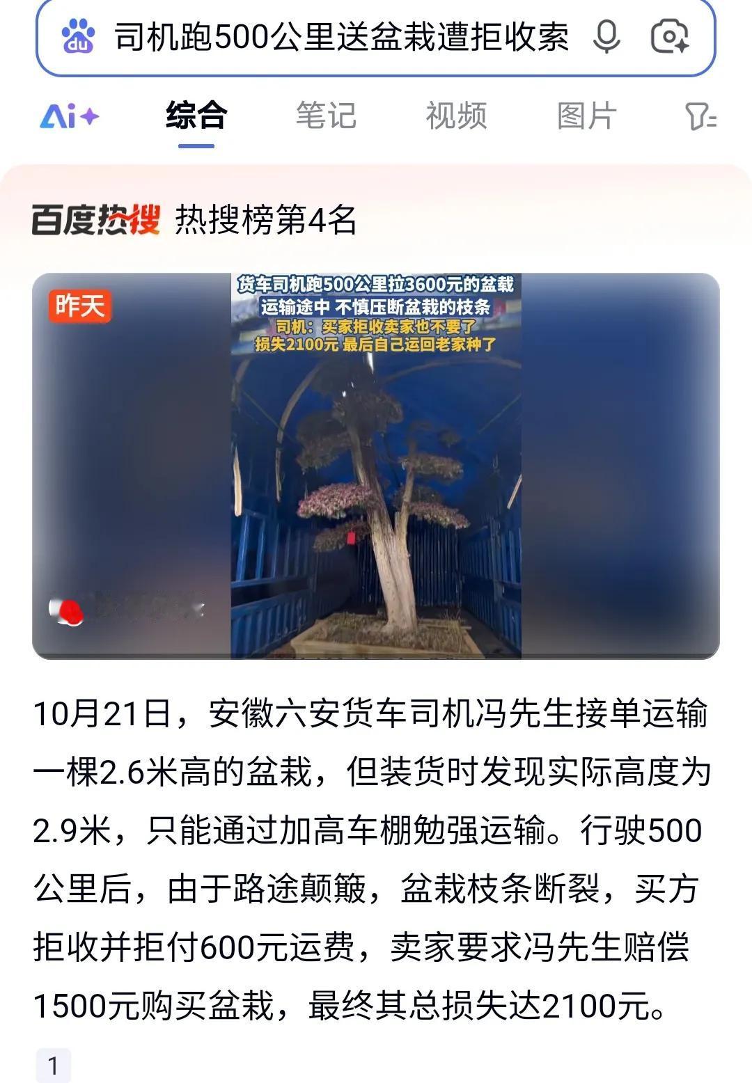 家人们,今天得给你们唠唠一个糟心事儿!安徽六安有个货车司机冯师傅,接了个送盆栽的单子,要跑500公里呢! 本来卖家说盆栽高2.6米,冯师傅想着自己车厢能装下,就接了这单。可到装货的时候傻眼了,这盆栽实际高2.9米!冯师傅怕退单影响信誉,就找了根竹子把雨布撑高,勉强把盆栽装上了车。 一路上500公里颠颠簸簸,冯师傅心里一直悬着,就怕出啥问题。结果呀,怕啥来啥!到地方一开车厢,竹子掉了,压断了两根树枝,叶子也掉了不少。买方一看,直接拒收,600块运费也不给了。冯师傅没办法,找卖家商量,卖家倒好,让冯师傅赔1500元买下盆栽。 最后冯师傅只能含泪掏了1500元,这一趟下来,运费没拿到,还倒贴1500元,亏了2000多元! 其实啊,从法律角度讲,三方都有责任。卖家虚报高度,有责任。冯师傅明知装货不合规还冒险运,也有责任。买方呢,因为这点小瑕疵就拒收,也有点太不近人情。 咱就说,这事儿真的太让司机委屈了!大家觉得这事儿谁的责任更大呢?快来评论区说说吧!