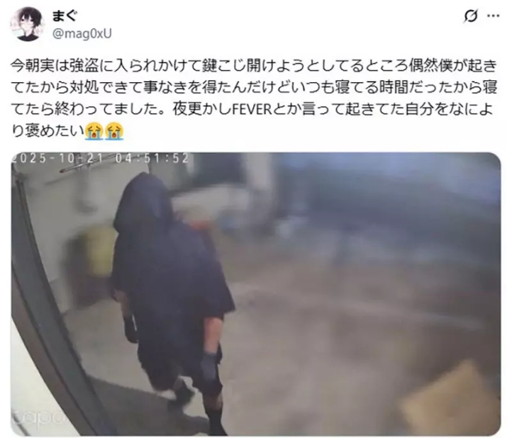 据他说有强盗试图在深夜撬开他家的门,还好当天他在熬夜玩《宝可梦传说 Z-A》所以正好醒着,他赶紧发出声响、开灯,吓跑了对方并已经报警。要不是如此恐怕早就被强盗入侵。