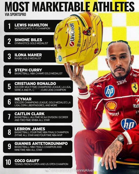 体育商业媒体SportsPro发布2025年度榜单——全球TOP50最具市场价值运动员,其中F1车手汉密尔顿位列第一。网球运动员有6位在列。