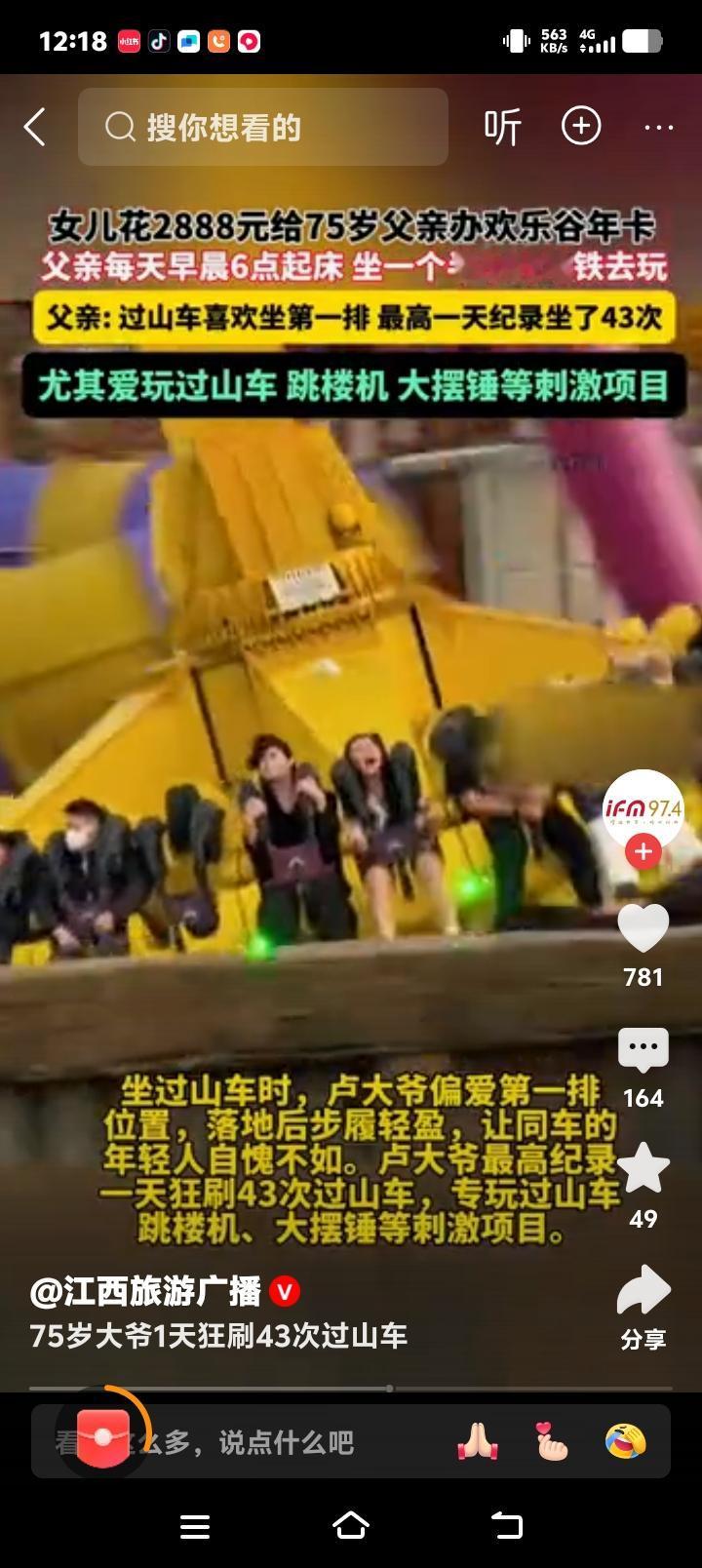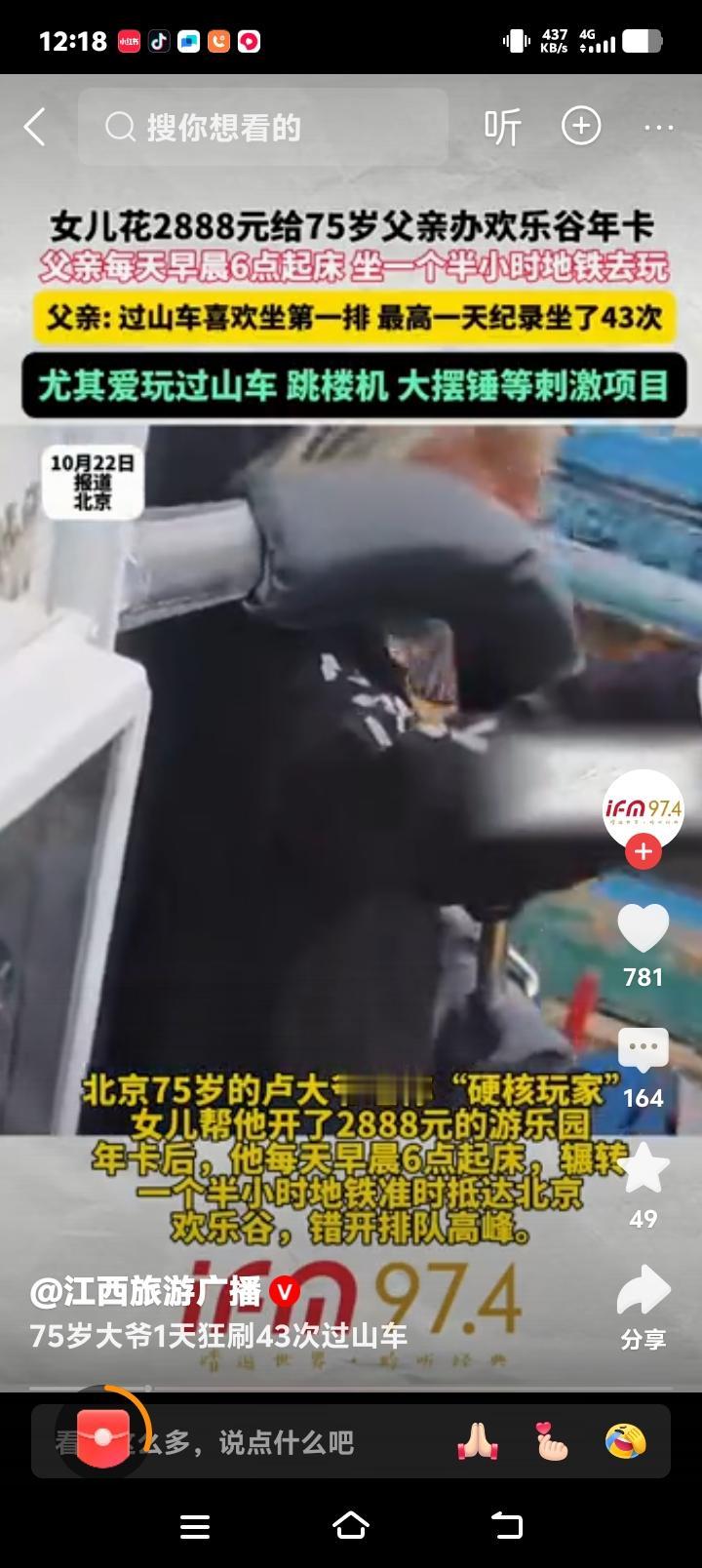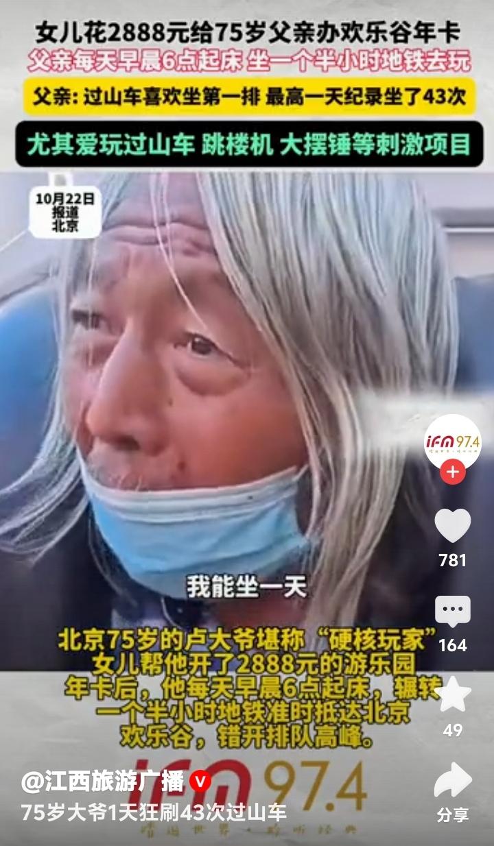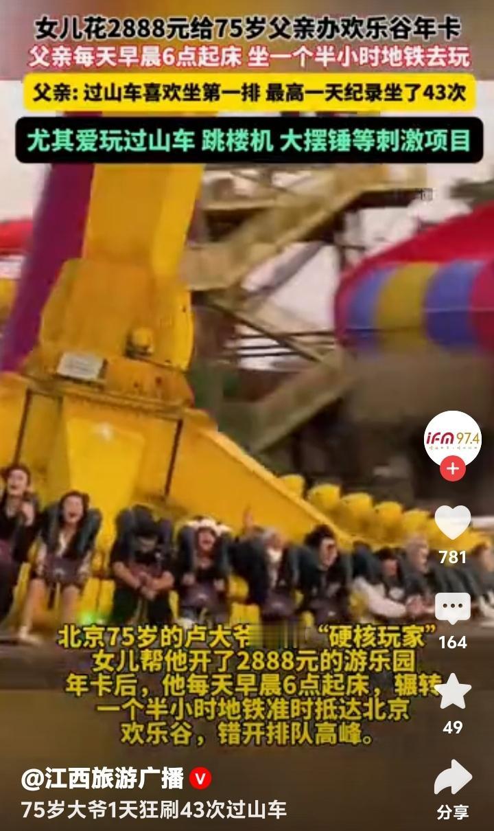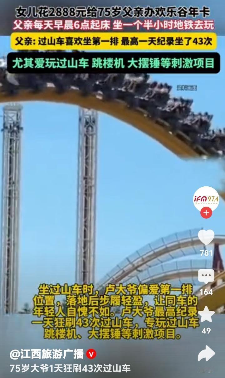 北京75岁硬核大爷日刷43次过山车秘密曝光!每天清晨六点穿越半座城追逐失重快感,年轻人看完沉默狂奔健身房 (来源:黄河新闻网吕梁频道、大象新闻综合、江西旅游广播等多家媒体报道) 当晨曦微露,北京的地铁尚未迎来早高峰的人潮,一位白发苍苍的身影已悄然踏上征程。75岁的卢大爷手提保温杯,步履生风地穿梭在换乘通道中,目标明确——奔赴欢乐谷的过山车轨道。这段一个半小时的旅途,对他而言不是疲惫的通勤,而是通往青春的秘密隧道。 旁人眼中惊险刺激的过山车,却是卢大爷每日的“晨练”。女儿为他办理的2888元年卡,成了他解锁快乐的通行证。他笑着说:“第一排视野最好,风吹在脸上,好像能把烦恼全都甩出去。”话音未落,他又一次扣紧安全压杠,在年轻人的惊呼声中冲上云霄。 一天43次过山车纪录的背后,藏着一个时代的反差。当不少年轻人被加班掏空体力、被手机绑架生活时,这位古稀老人用行动诠释了什么是“活力全开”。他玩遍跳楼机、大摆锤,面不改色心不跳,落地后甚至悠闲地哼起小曲,引得围观游客连连惊叹:“这身体素质,我20岁都比不上!” 更令人动容的是父女间的默契。女儿的一句“爸爸开心最重要”,胜过万千物质馈赠。她不曾用“老年人该有的样子”束缚父亲,反而支持他打破年龄的枷锁。这种亲情,不是单方面的赡养,而是双向的精神共鸣。正如网友感慨:“推着轮椅带父母看风景是孝,但陪他们疯玩一场,何尝不是更高级的陪伴?” 卢大爷的活力并非偶然。几十年如一日的规律作息、乐观心态,让他远离慢性病的困扰。他的保温杯里没有枸杞,只有白开水;他的背包里没有药瓶,只有擦拭过山车座位的毛巾。他用行动撕碎了“老人=衰弱”的标签,仿佛在告诉世界:衰老的只是数字,生命的激情永远可以沸腾。 这场银发与钢铁轨道的碰撞,照见了当代人的焦虑。为什么我们总把“等退休”“等有空”挂在嘴边,却忘了快乐可以随时启程?卢大爷的过山车哲学,或许正是都市人缺失的那一课:热爱从不需等待完美时机,此刻就是最好的出发。 有网友调侃:“大爷是不是偷偷练了轻功?”但更多人在评论区写下自己的触动。有人决定带父母体验一次过山车,有人开始每天早起跑步。卢大爷像一面镜子,照出了我们对待生命的态度——是囿于年龄的桎梏,还是活出自由的宽度? 当夕阳西下,卢大爷踏上归途,脸上仍挂着孩童般的笑意。他或许不知道,自己在社交媒体上掀起了一场关于年龄与勇气的讨论。但可以肯定的是,那43次呼啸而过的轨迹,早已划破天际,点亮了无数人心中被遗忘的星光。 北京75岁 大爷 坐过山车日刷43次 年龄只是数字 活出自我