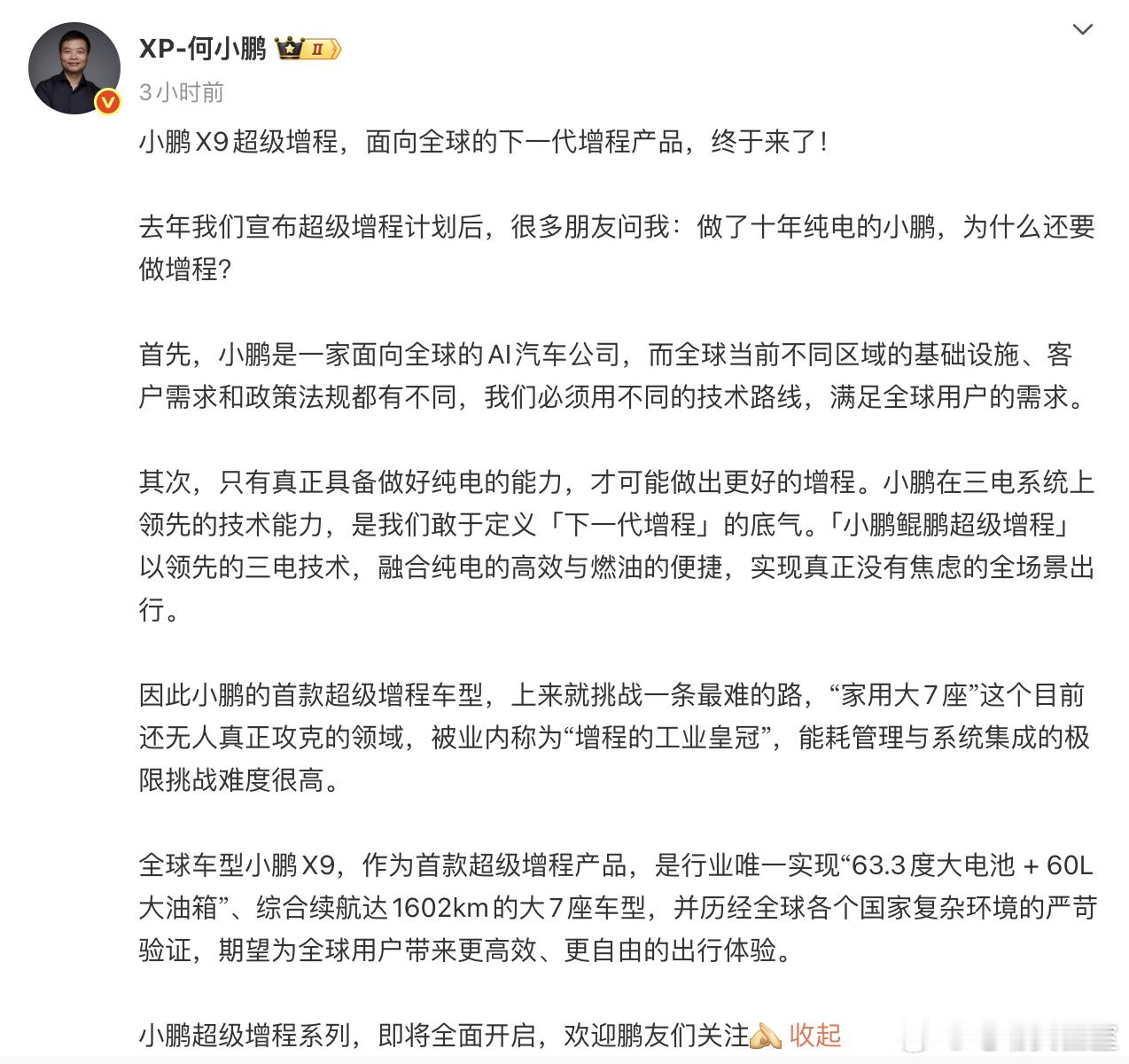 借着今天小鹏X9超级增程的官方预告,大师兄再次解释“做了十年纯电的小鹏,为什么还要做增程?”