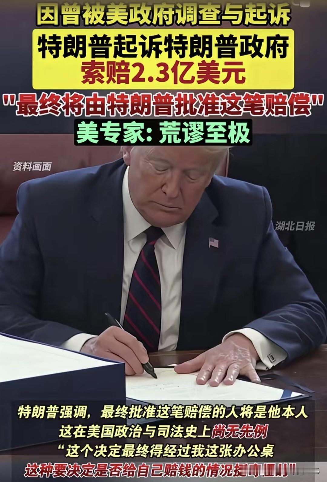特朗普起诉自己政府索赔2.3亿,还要自己批赔偿 特朗普因为之前被美国政府调查起诉,现在反过来起诉特朗普政府,索赔2.3亿美元。他还强调最终批准这笔赔偿的得是他自己。 美国专家都直呼“荒谬至极”。他自己也说“这个决定最终得经过我这张办公桌,这在美国政治和司法史上可是头一遭,网友调侃:“特朗普炒股票大半年发现不如直接从国库转账来得快。”对此你怎么看?