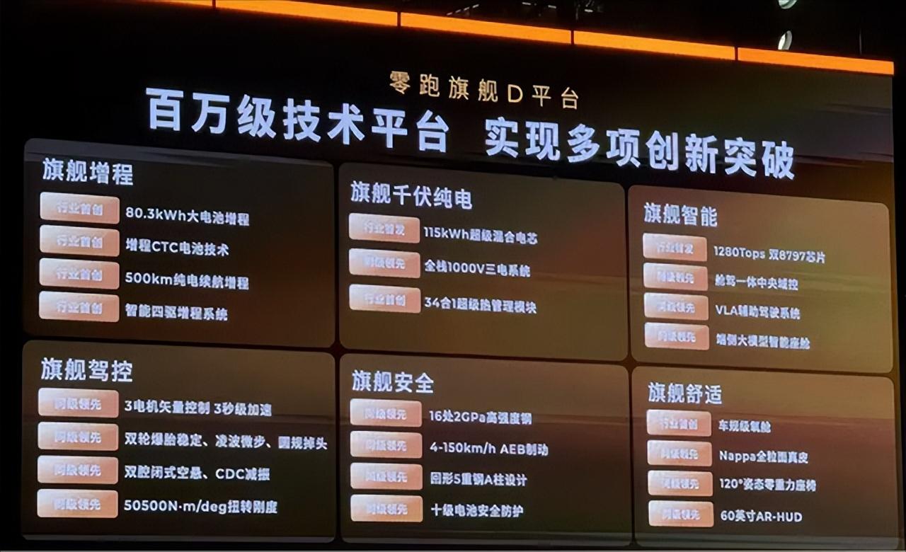 作为全球首搭高通骁龙双 8797 至尊芯片的车型,零跑 D19 以双芯协同实现 1280TOPS 综合算力,单颗芯片算力达 320 片的车型,零跑 D19 以双芯协同实现 1280TOPS 综合算力,单颗芯片算力达 320TOPS,较同级常用芯片性能实现代际跃升。 该芯片首次实现座舱与辅助驾驶的单芯片融合,通过虚拟化技术保障任务安全,配合车顶激光雷达与多维度传感器,可支持城区领航、记忆泊车等高阶功能,智能化水平直追一线豪华品牌。 二、动力革新:双高压平台破解续航焦虑 新车提供纯电与增程双动力方案,技术实力全面突破: 纯电版:基于 1000V 高压平台打造,配备 115kWh 超级混合电芯,CLTC 续航最高可达 800km,充电 15 分钟即可补充 350km 续航,补能效率领先同级。 增程版:搭载 80.3 度大容量电池,纯电续航达 500km,配合 1.5T 增程器,综合续航突破 1400km,零百加速 4.8 秒的同时,WLTC 工况油耗仅 0.7L/100km,兼顾性能与节能。 三、空间实力:全尺寸布局满足高端需求 作为车长 5.25 米、轴距 3.12 米的全尺寸 SUV,D19 提供六座或七座可选布局,第三排可舒适容纳 1.8 米成年人。常规状态下后备厢容积达 840L,可容纳 4 个 28 寸行李箱加婴儿车,放倒第三排后更能拓展超大储物空间,精准匹配多孩家庭出行需求。 四、上市信息:30 万级享百万级体验 这款凝聚零跑十年全域自研成果的旗舰 SUV,将豪华配置与亲民价格完美平衡,预计售价 25 万起,将于 2026 年上半年正式上市。从双腔空悬到森野氧舱,从 Nappa 真皮内饰到端侧大模型座舱,零跑 D19 正以技术实力撕掉 “廉价” 标签。 零跑 D19