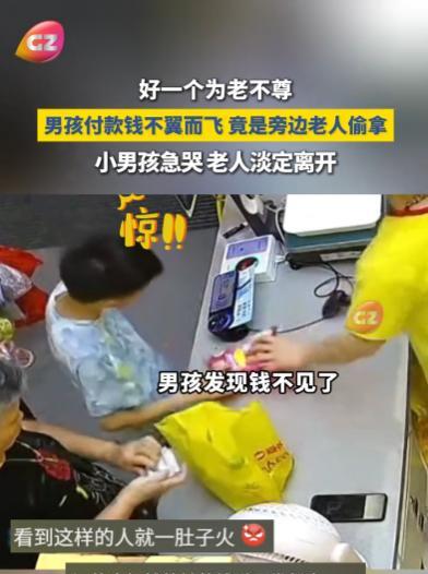 “太缺德了!”10月20日,广东,一小男孩买零食时将钱放在收银台桌面,一旁的老人趁男孩捡东西直接把钱拿走,随后淡定离开,留下找不到钱的男孩在收银台前不知所措,网友:你就缺那几块钱吗? 并不是所有的老人都慈祥的,坏人变老了还是坏人,作为老人不能给年轻人做表率,反而做些偷鸡摸狗的事,为老不尊! 一小男孩在超市买零食,他将兜里的钱掏出来放在了收银台上,随后低下头捡东西,一旁的老人眼睛瞥见钱,自然地拿在了自己的手上。 因为老人的动作太自然,后面排队的顾客没有发现异常,收银员在忙,也没有注意到老人将钱拿走,小男孩发现钱不见了,急忙四处寻找。 而老人竟然无视焦急的男孩,淡定转身离开,假装什么都没发生过,徒留找不到钱的男孩在原地不知所措,老人以为自己的行为天衣无缝,殊不知头顶的摄像头将这一切都拍了下来。 不少网友认为老人为老不尊,也有人觉得是老太糊涂了,可是如果真记不清是不是自己的钱,看到焦急找钱的男孩也应该问上一句吧,拿完钱转头就走看起来就像是心虚的动作,一把年纪还干出这种事,简直丢人现眼! 信息来源:《男孩超市买零食,付款时钱不翼而飞。幸好店内监控拍下旁边老人偷拿的一幕。》广州广播电视台