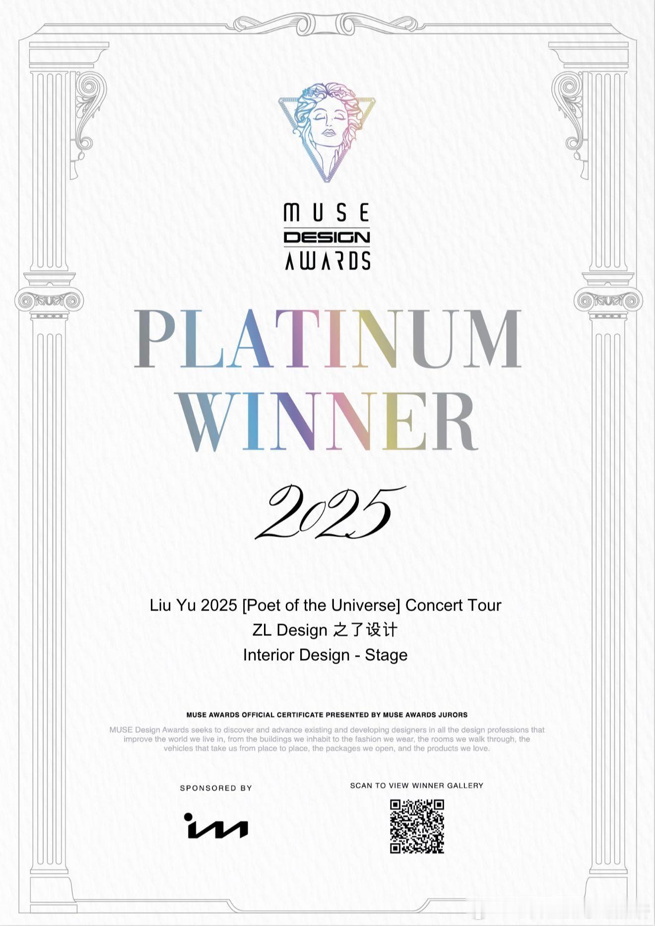 刘宇宇宙诗人巡演获得缪斯设计奖舞台类别最高荣誉铂金奖🏆