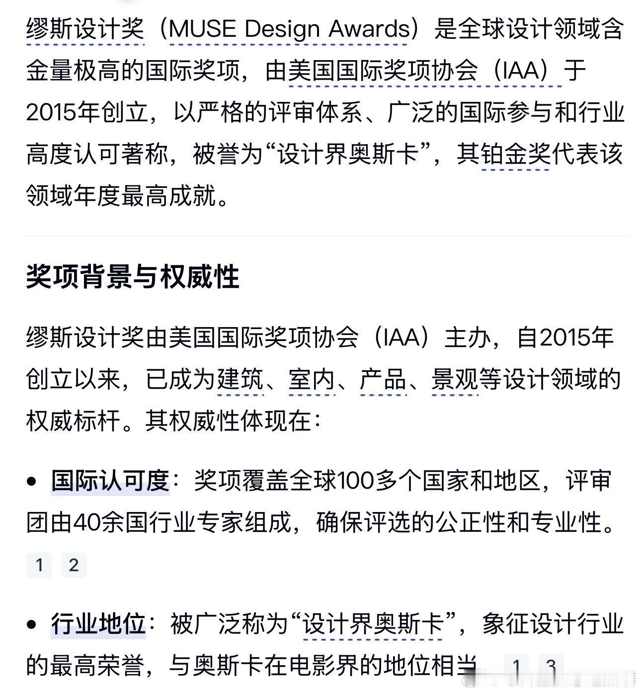 缪斯设计奖(MUSE Design Awards)是全球设计领域含金量极高的国际奖项,由美国国际奖项协会(IAA)于2015年创立,以严格的评审体系、广泛的国际参与和行业高度认可著称,被誉为“设计界奥斯卡”,其铂金奖代表该领域年度最高成就。