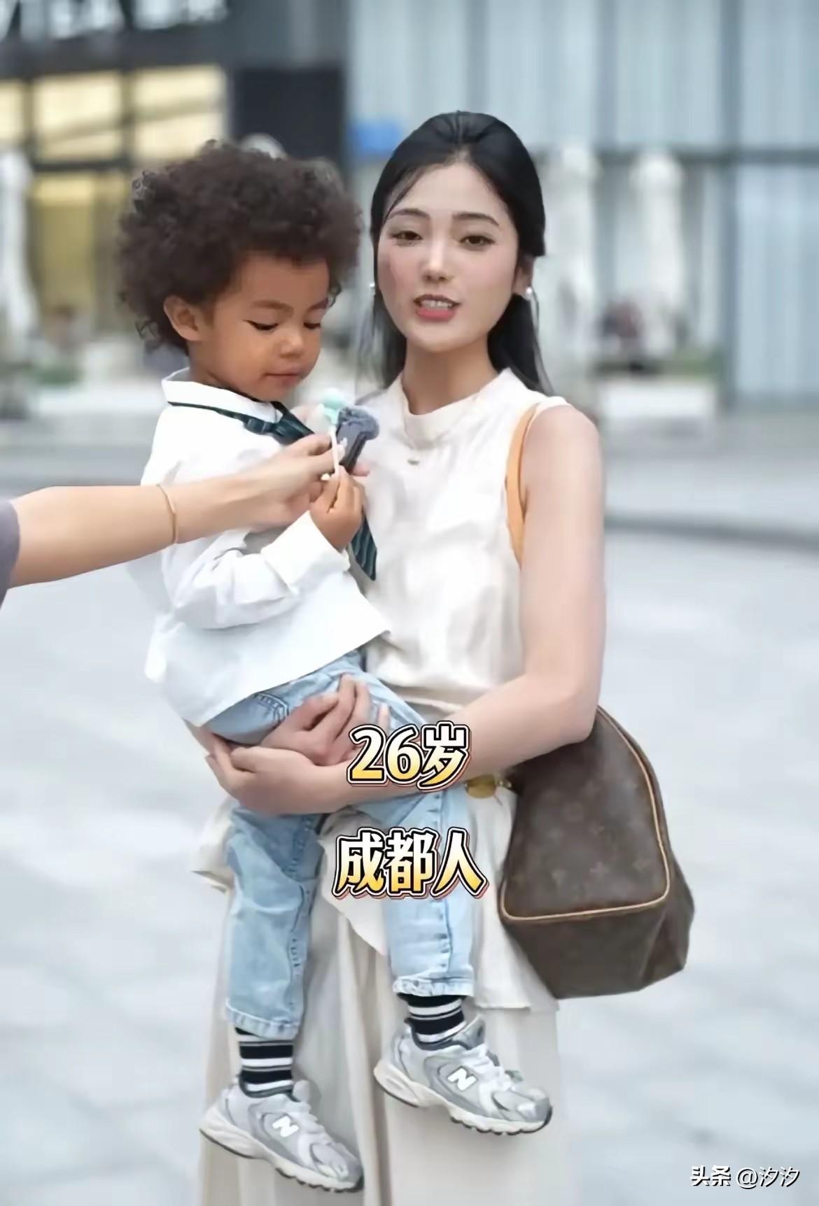 26岁的成都单亲妈妈在街头被采访, 她的孩子看起来有些时尚, 爆炸头加上黝黑的皮肤, 一看就是老外的孩子, 年少不知事, 错把老外当成宝, 如今离婚又带孩, 孩子父亲消失不见, 看她的打扮应该工作还可以, 一个人养家也是可以的, 她表示当时和前夫是在广州认识的, 他风趣幽默, 对我很好的, 我们两个也是一见钟情, 总是对跨国恋充满向往, 如今自己种的恶果只能自己来尝, 她自己体验过才知道, 老外男人比中国男人不靠谱, 老外都是追求自由开放, 更加注重享受当下欢愉, 中国男人内敛负责任讲述家庭, 她的前夫就是婚后出轨, 这让两人离了婚, 如今自己也不打算再找了, 独自抚养孩子生活! 大家对于成都精致女带个混血儿独自生活怎么看? 婚姻与家庭 单亲妈妈 单亲女性困境 单亲家庭子女 单亲家庭