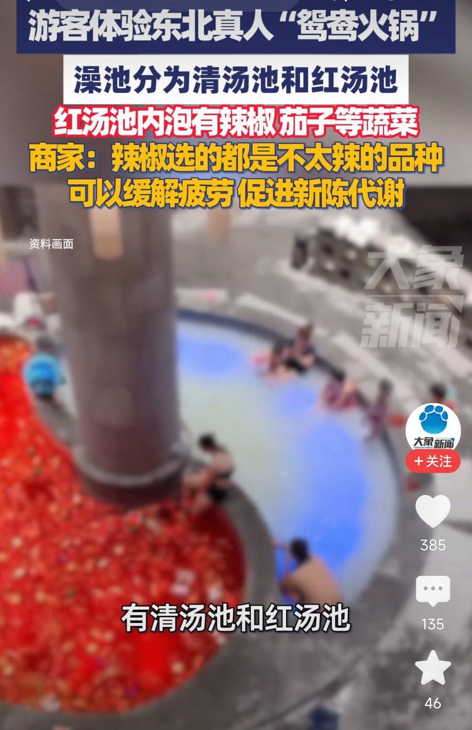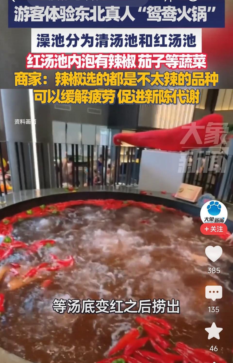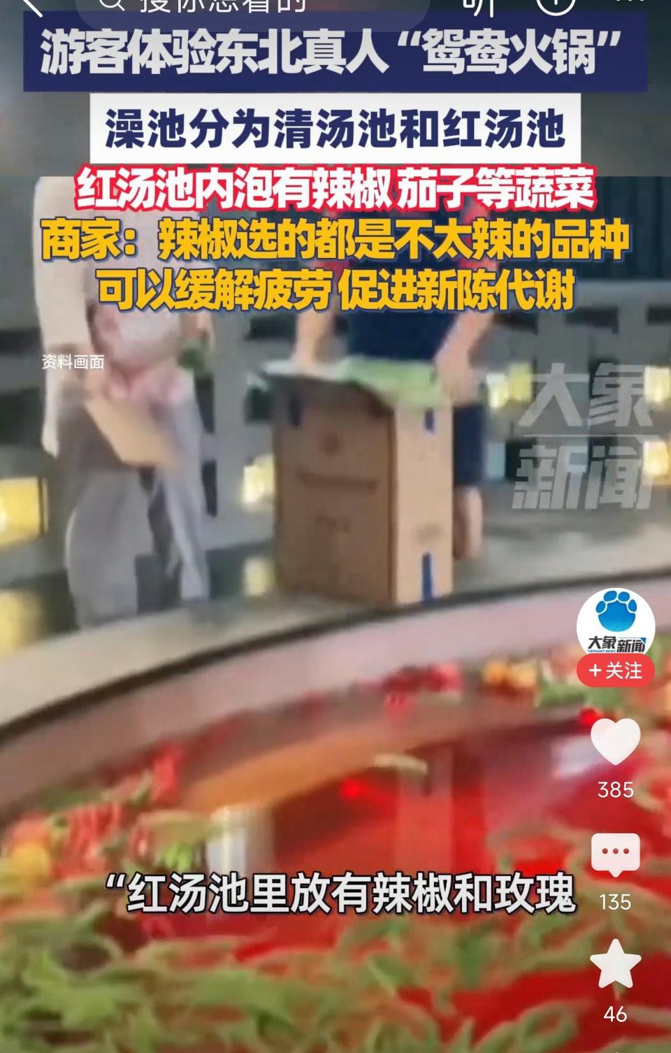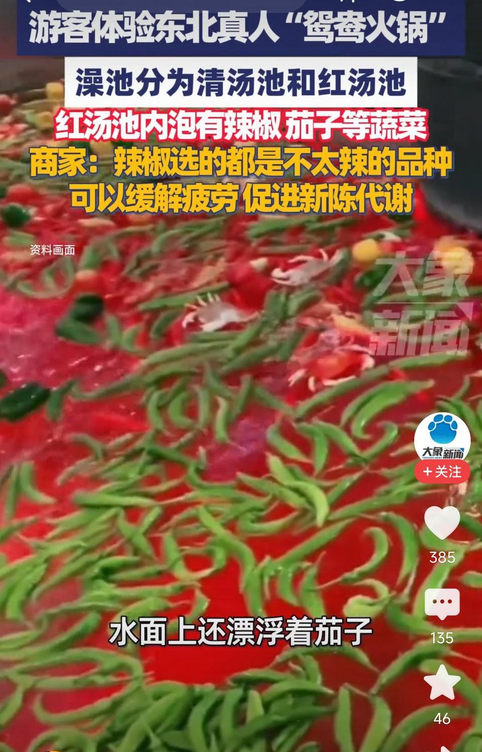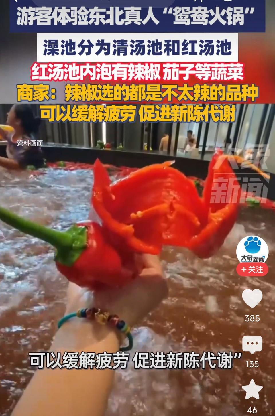 东北真人版“鸳鸯火锅”,有辣椒、茄子等蔬菜,商家:都是不太辣的辣椒,可以缓解疲劳,促进新陈代谢。 网友表示: 要是下面在架起柴火,鸳鸯锅就齐了。 不愧为洗浴之都!全国洗浴看东北! 有痔疮不知道下去啥感觉? 创意不错,怎么样解决卫生问题? 看来人不能太安逸了,吃饱喝足,竟想着稀奇古怪的玩法,然后打着养生有益的幌子,搞钱。新鲜刺激,够辣,还真是应景。 辣椒水洗澡,不辣么?不辣的辣椒也是辣椒! 有意思,辣椒浴,东北人会玩,会不会辣屁股?