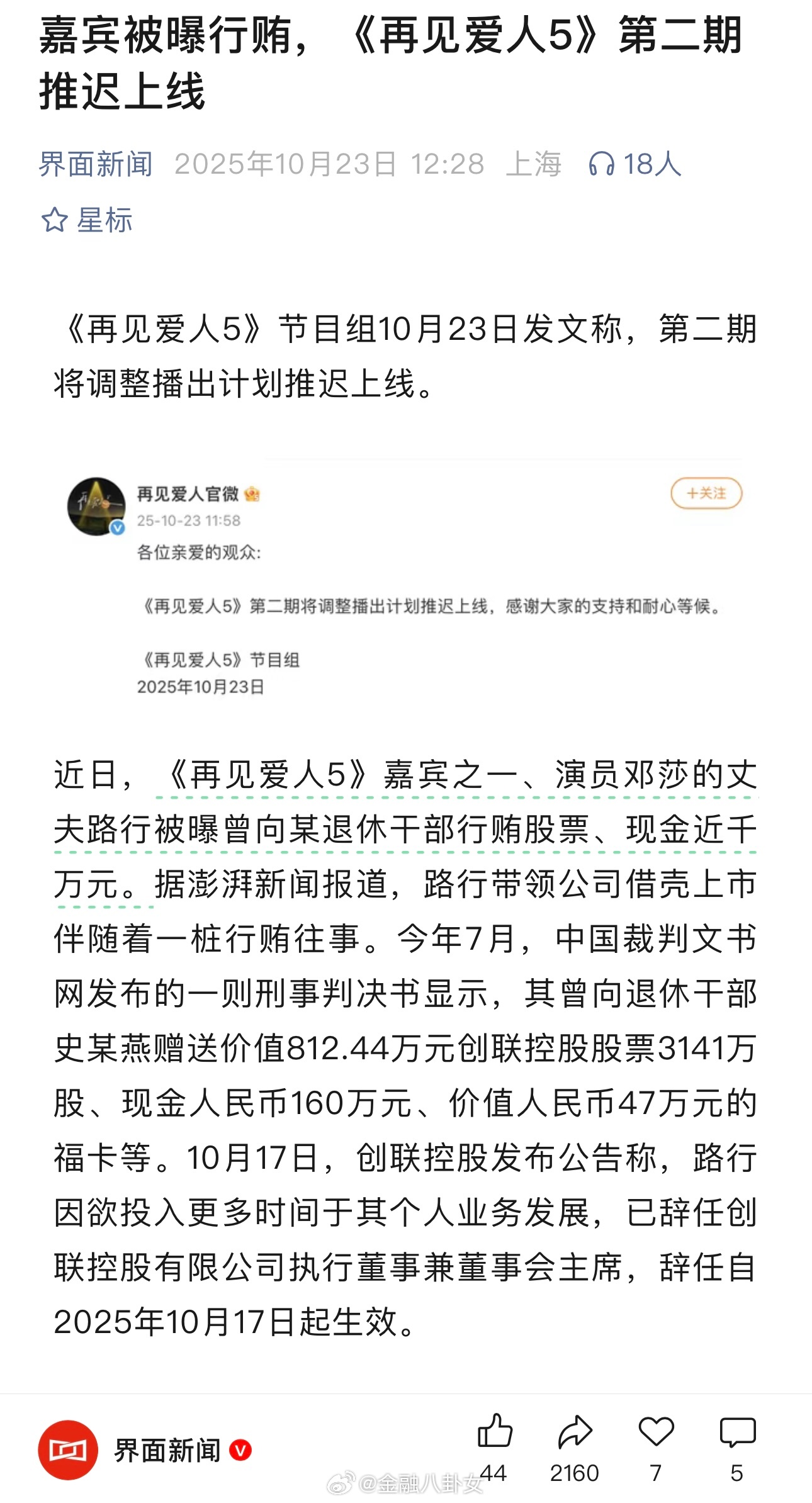 嘉宾被曝行贿,《再见爱人5》第二期推迟上线[吃瓜] 再见爱人5第二期推迟上线