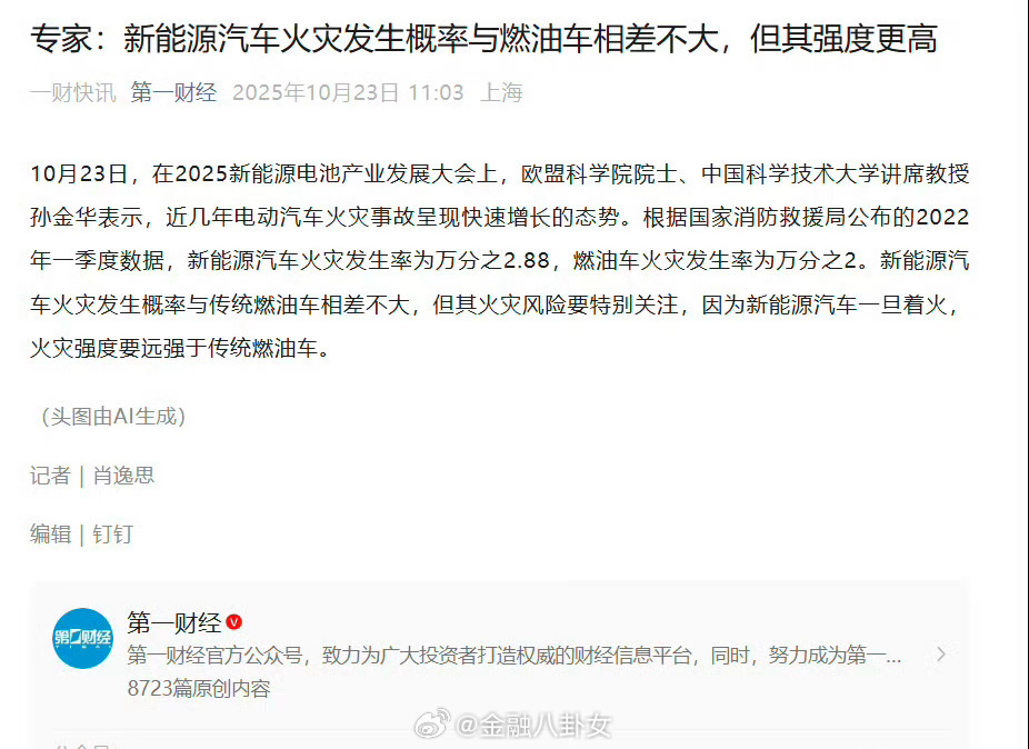 专家:新能源汽车火灾发生概率与燃油车相差不大,但其强度更高(第一财经)[思考]