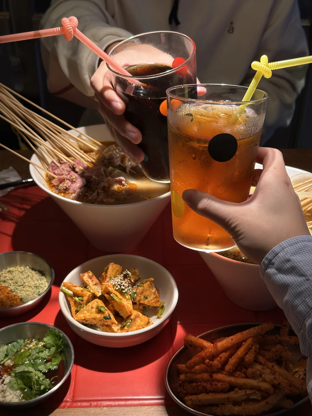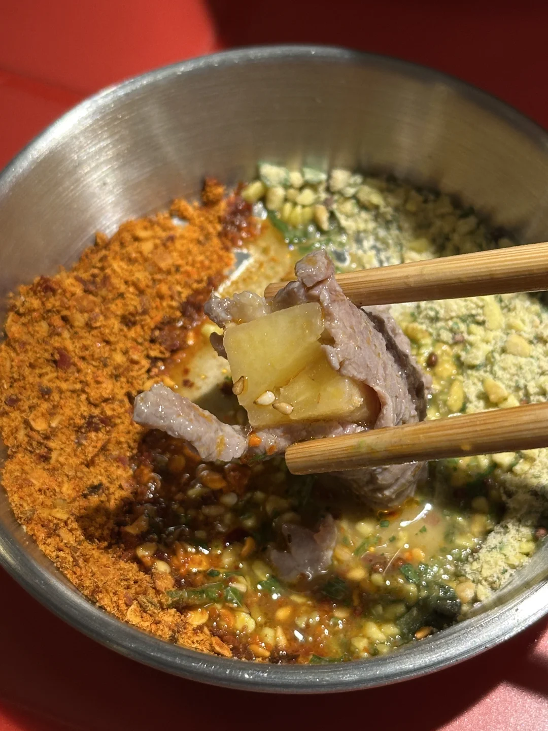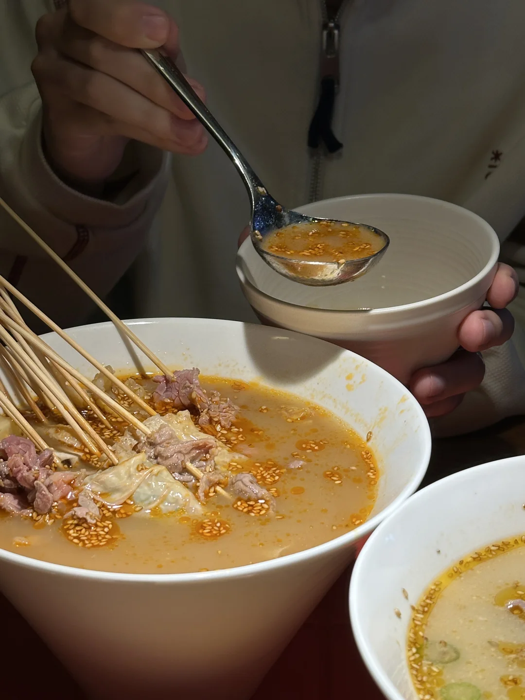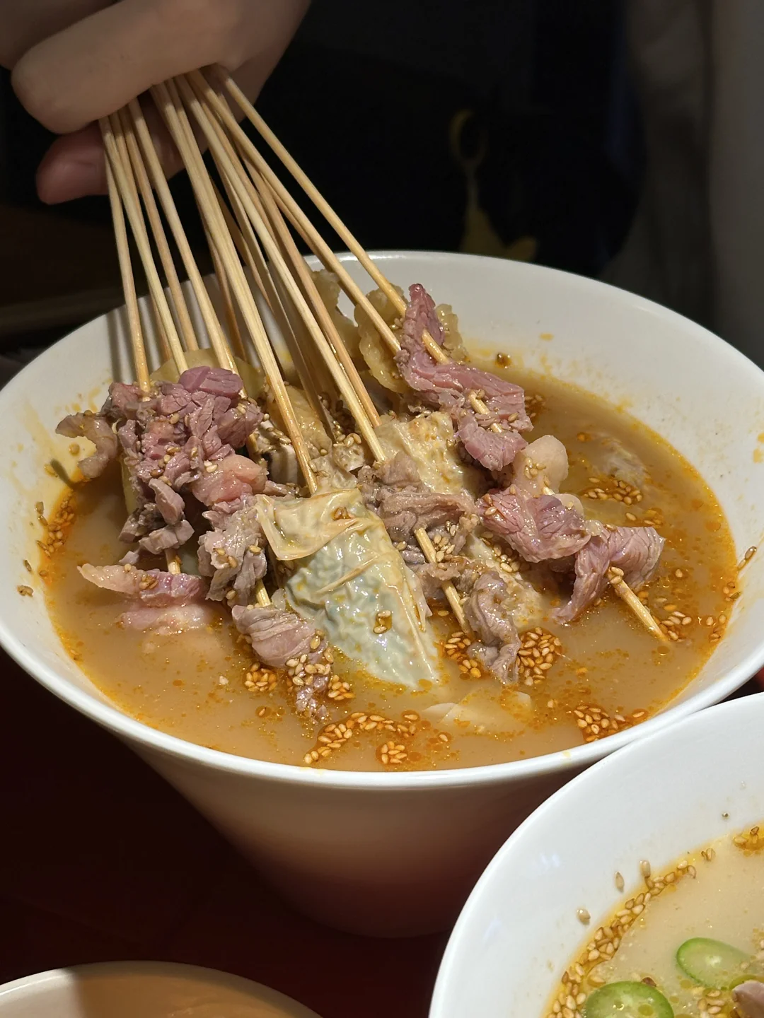 浓鸡汤底串串好好吃 不齁咸 新鲜牛肉很嫩 吊龙夸夸 菠萝牛肉也是要点的 非常猪斯 降温和辣串好搭 真的吃欢了
