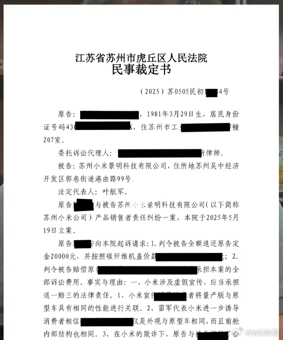 报道:车主指控小米汽车虚假宣传案宣判,江苏省苏州市中级人民法院驳回小米汽车上诉,二审维持原判,消费者胜诉,小米汽车需退还消费者定金2万元,并按选装价款三倍赔偿12.6万元及律师费1万元。