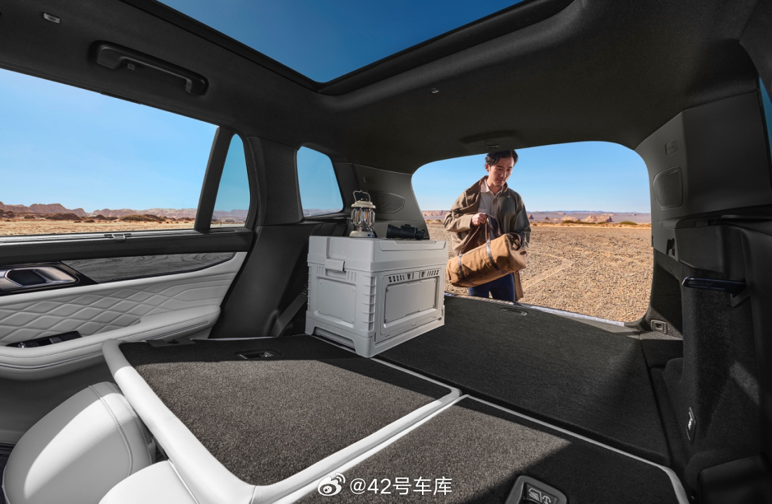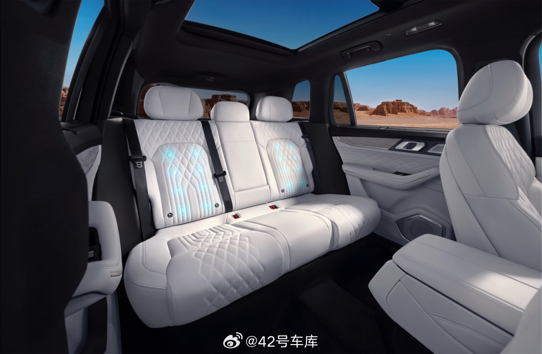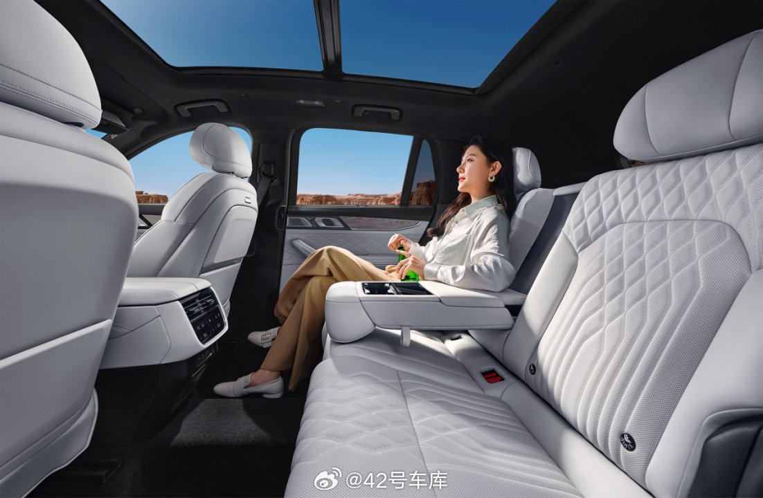 - 二排新增多功能中央扶手、小桌板,全车 Nappa 真皮覆盖,三档加热、通风和 8 点式背部按摩由前排独享进阶为四座同享,搭配双层静音隐私玻璃和遮阳帘,副驾还新增 280 mm 一体式 4 向电动腿托;
