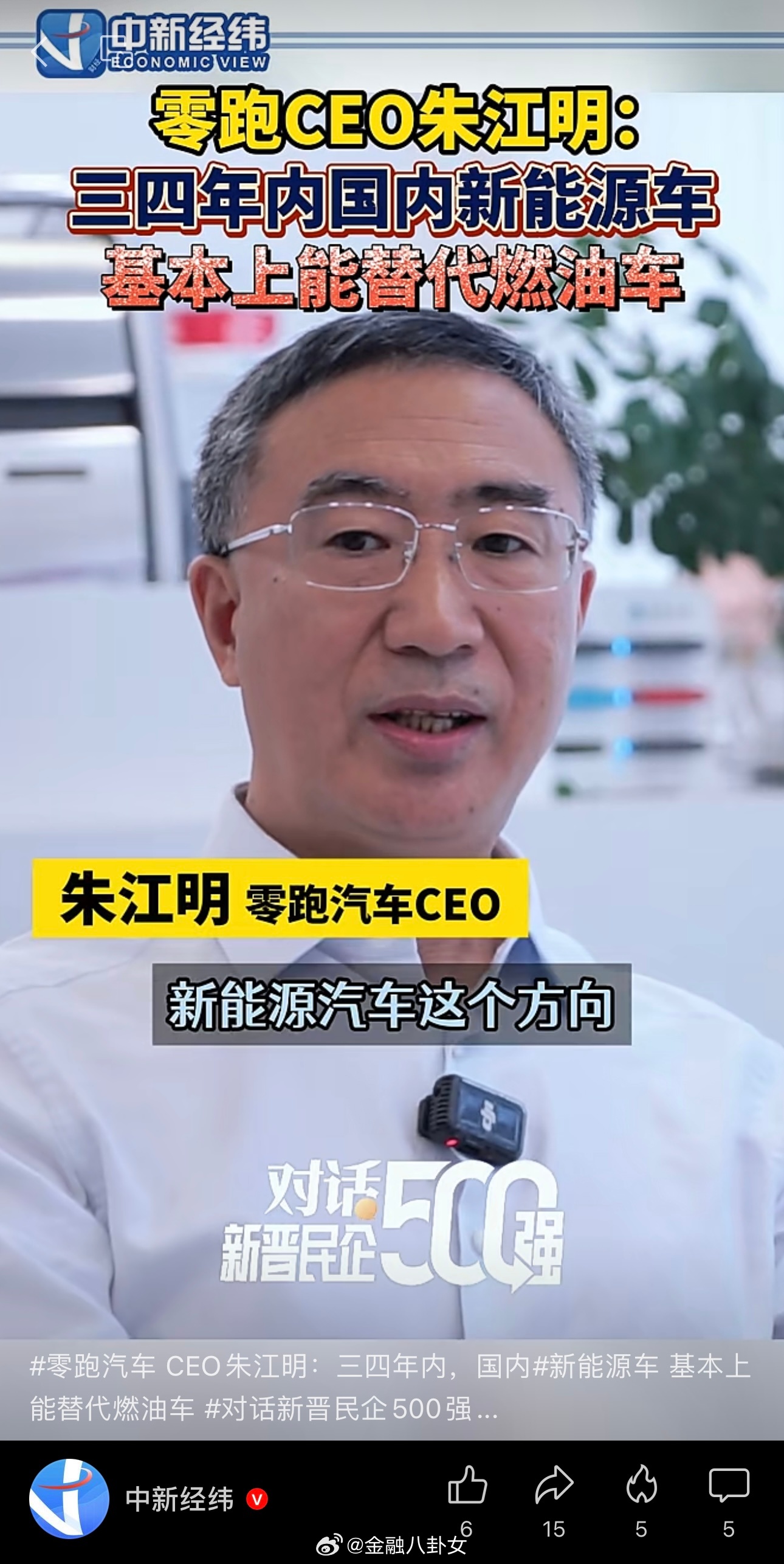 零跑CEO朱江明:三四年内国内新能源车,基本上能替代燃油车[思考]