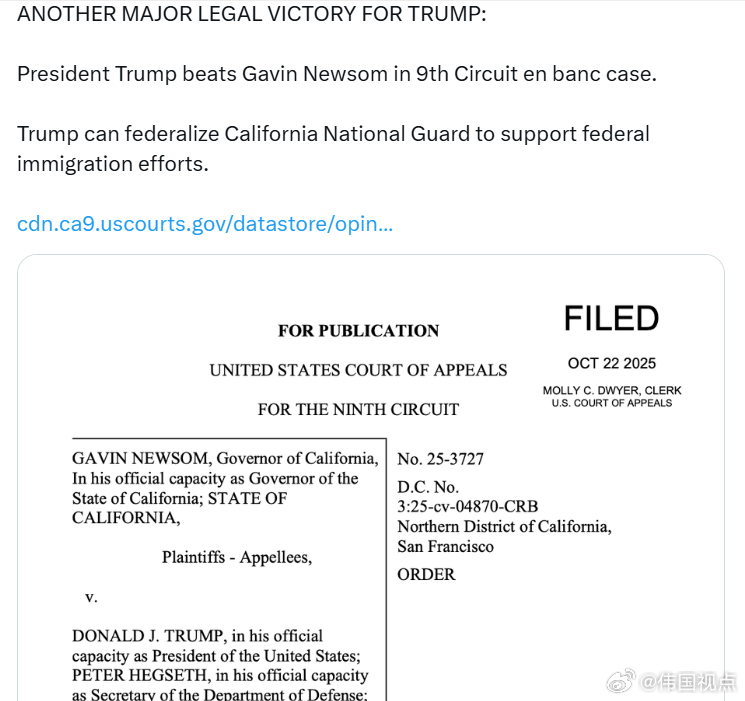 裁决结果:特朗普有权将加州国民警卫队联邦化,以支持联邦层面的移民执法行动。