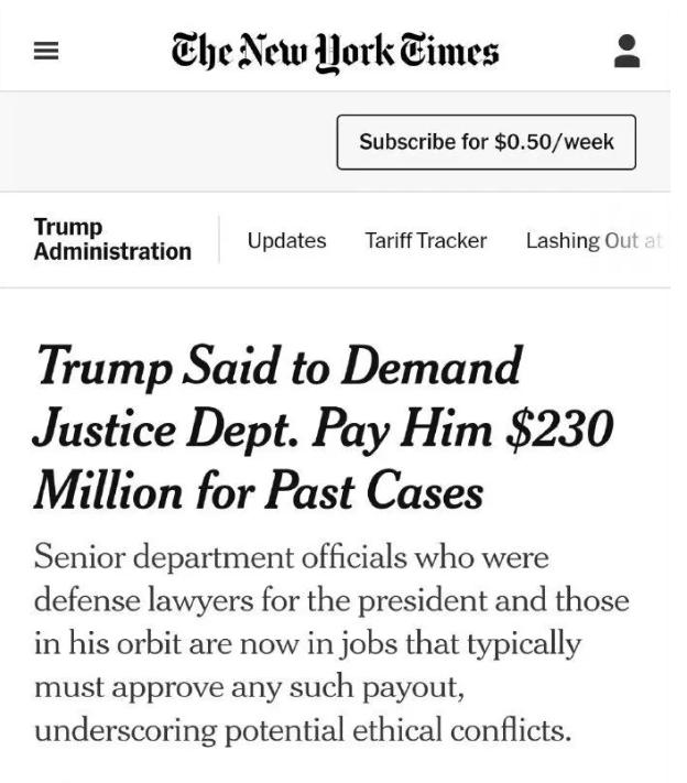 10月21日,《纽约时报》爆料后,整个华盛顿都炸锅了:现任总统特朗普居然要求自家司法部赔他2.3亿美元(约合人民币16亿),理由是前几年司法部调查他,让他“心灵受伤”了。 这不是开玩笑,而是通过正式的行政索赔程序提交的——从2023年就开始酝酿,现在他上台了,索赔对象就是他自己手下的部门。   说起来,特朗普嘴里的“调查”,就是2022年FBI搜他海湖庄园那回,当时司法部说他可能违反了《间谍法》,从里面抄出11000多份政府文件,还有18份最高机密。其实2024年他就找司法部要过1亿,说调查坏了他名声,结果才过一年,索赔金额直接翻倍,连理由都变了,从“名声受损”改成“心灵受伤”,这戏码比好莱坞喜剧还离谱。   更荒唐的是这程序上的事儿。按美国规矩,老百姓要找联邦部门索赔,得先递请求,被拒了才能去告。可特朗普是总统啊,他既是要赔钱的人,又是司法部的顶头上司,这不就是又当运动员又当裁判嘛?法律界的人都炸了,说要是总统能绕开规矩,自己跟自己手下要赔偿,那所谓的“三权分立”不就成了笑话?   再说说他这“心灵受伤”的理由,简直没道理。他说司法部一调查,他就“精神难受、睡不着觉”,连“为美国民众办事的劲儿都受影响了”。可法律专家都指出,美国有个《联邦侵权赔偿法》,里面写得明明白白,政府只赔身体受伤或者财产损失,“心灵创伤”除非能拿出医院的证明,不然法院根本不认。   更尴尬的是,2022年搜查刚过的时候,他还在社交平台上喊着“这是政治迫害”,甚至把这事儿当竞选的卖点,现在突然说自己“心灵受伤”,前后差这么多,法律界的人都怀疑他是拿诉讼当工具,想搞政治利益。   其实这索赔案,根本就是特朗普和司法部长期掰头的延续。从2022年开始,他就没闲着,一会儿是“机密文件案”,一会儿是“封口费案”,还有“商业欺诈案”,光2024年就面临91项重罪指控。现在他这么干,就是想反过来拿捏司法部,既转移大家的注意力,又能施压:你们要是再查我,我就用纳税人的钱给自己赔钱。   而且这事儿还可能影响2026年的中期选举。他的支持者把他吹成“对抗深层国家的英雄”,民主党那边却骂他“滥用职权”。有民调显示,差不多40%的共和党选民觉得“司法部调查是搞政治操弄”,两党就这么又吵起来,分裂得更厉害。   说起来,历史上也有过类似的事儿。1974年尼克松因为水门事件辞职,后来他的基金会找政府要3550万美元,说政府封了他的文件让他受了损失,结果法院直接驳回了,说“总统的文件是国家的,个人没资格索赔”。   现在特朗普这事儿,很可能重蹈覆辙,就算司法部象征性地拒了他,他说不定还会闹到联邦法院,想靠保守派法官搞个新先例。但尼克松那事儿已经说明,总统想通过司法系统给自己“找补”,最后很容易引发宪政危机。   说到底,特朗普这要16亿赔偿的事儿,把美式政治的荒唐劲儿全露出来了。总统把司法系统当工具,用纳税人的钱赔自己的“心灵创伤”,所谓的“三权分立”根基都在晃。这戏的结局咋样其实不重要,重要的是大家都看明白了:一旦权力没了制衡,那所谓的“民主”,不过是场带着铜臭味的政治秀。就像《纽约时报》评论的那样,特朗普这是在用16亿美元,给美式民主写最讽刺的墓志铭。