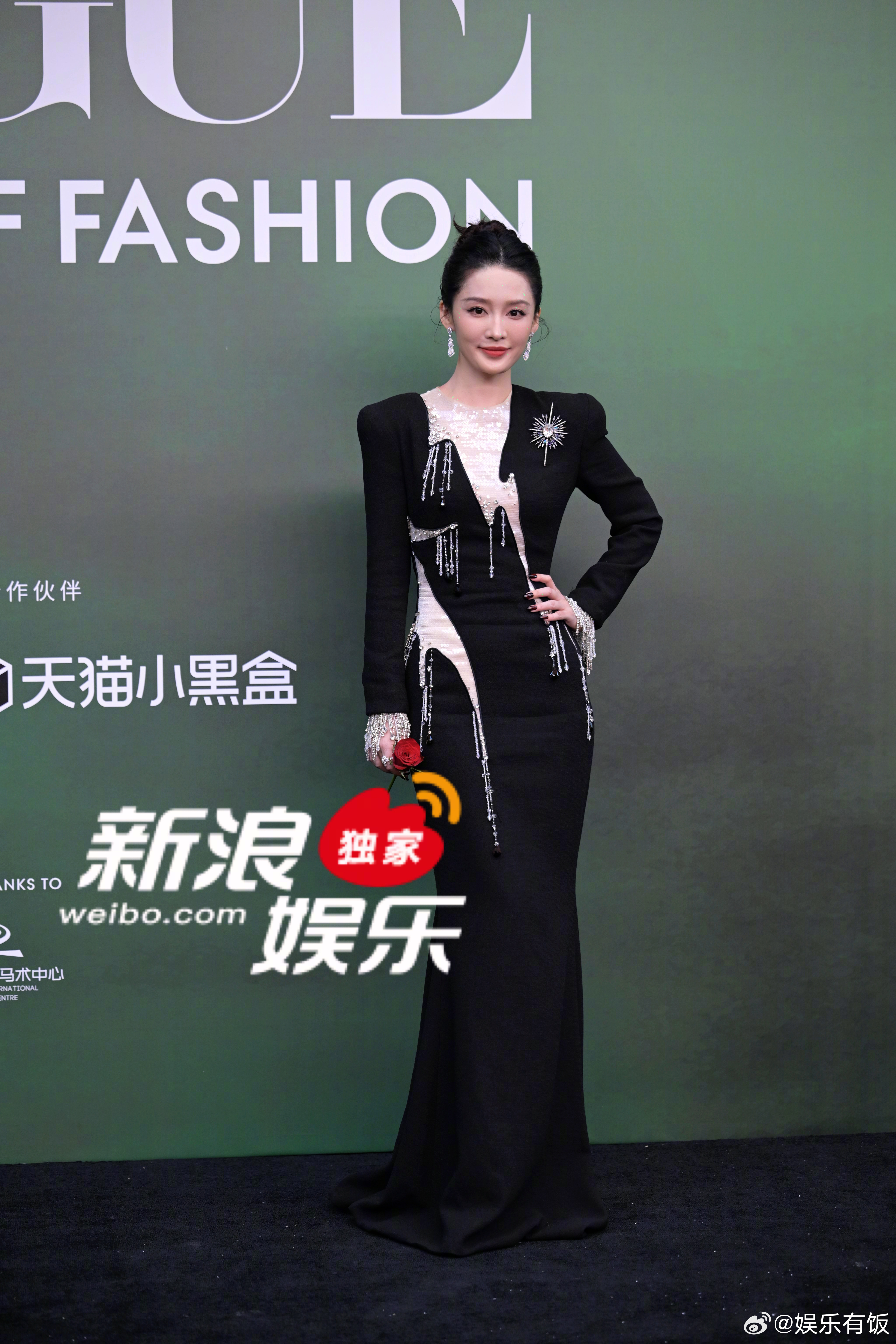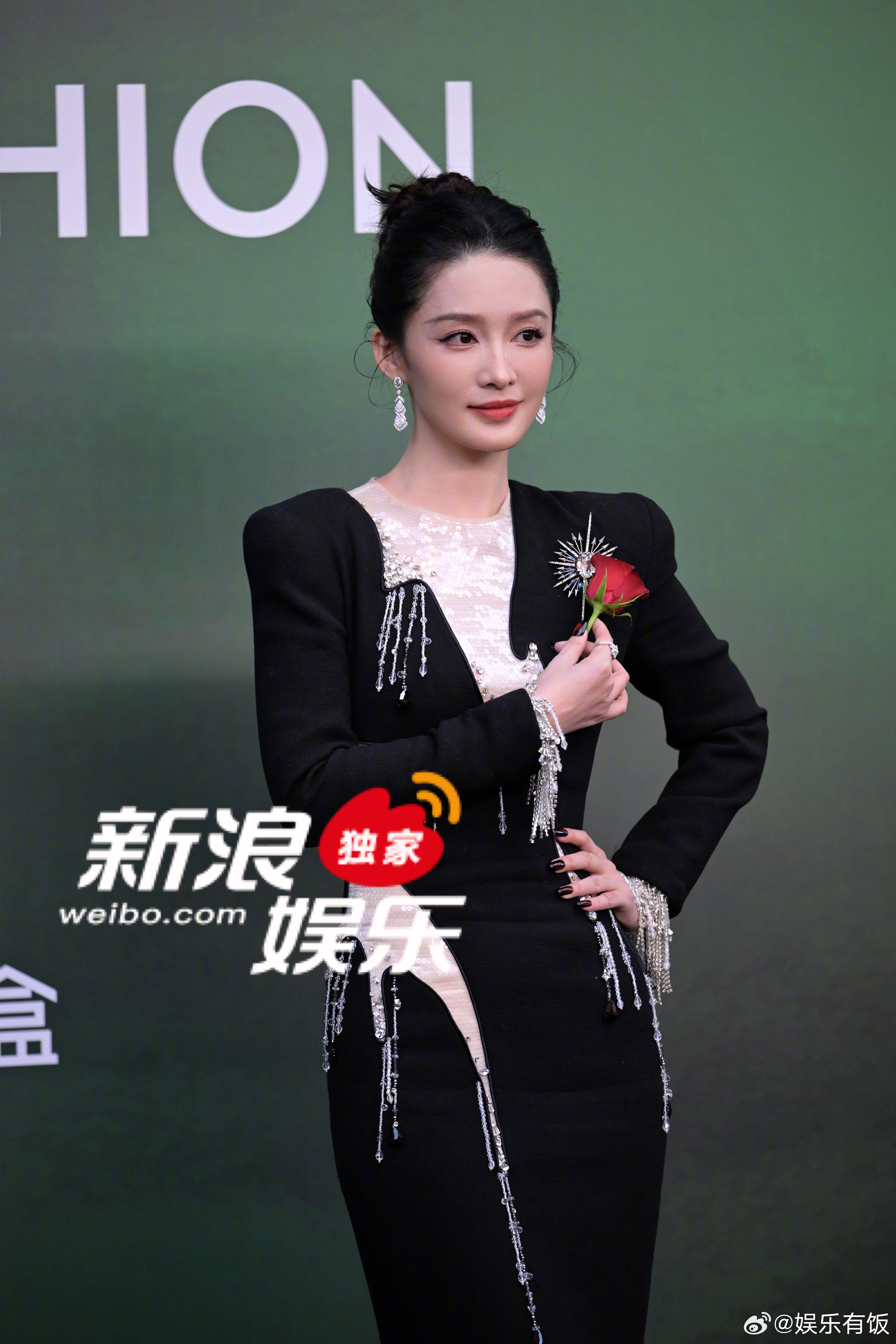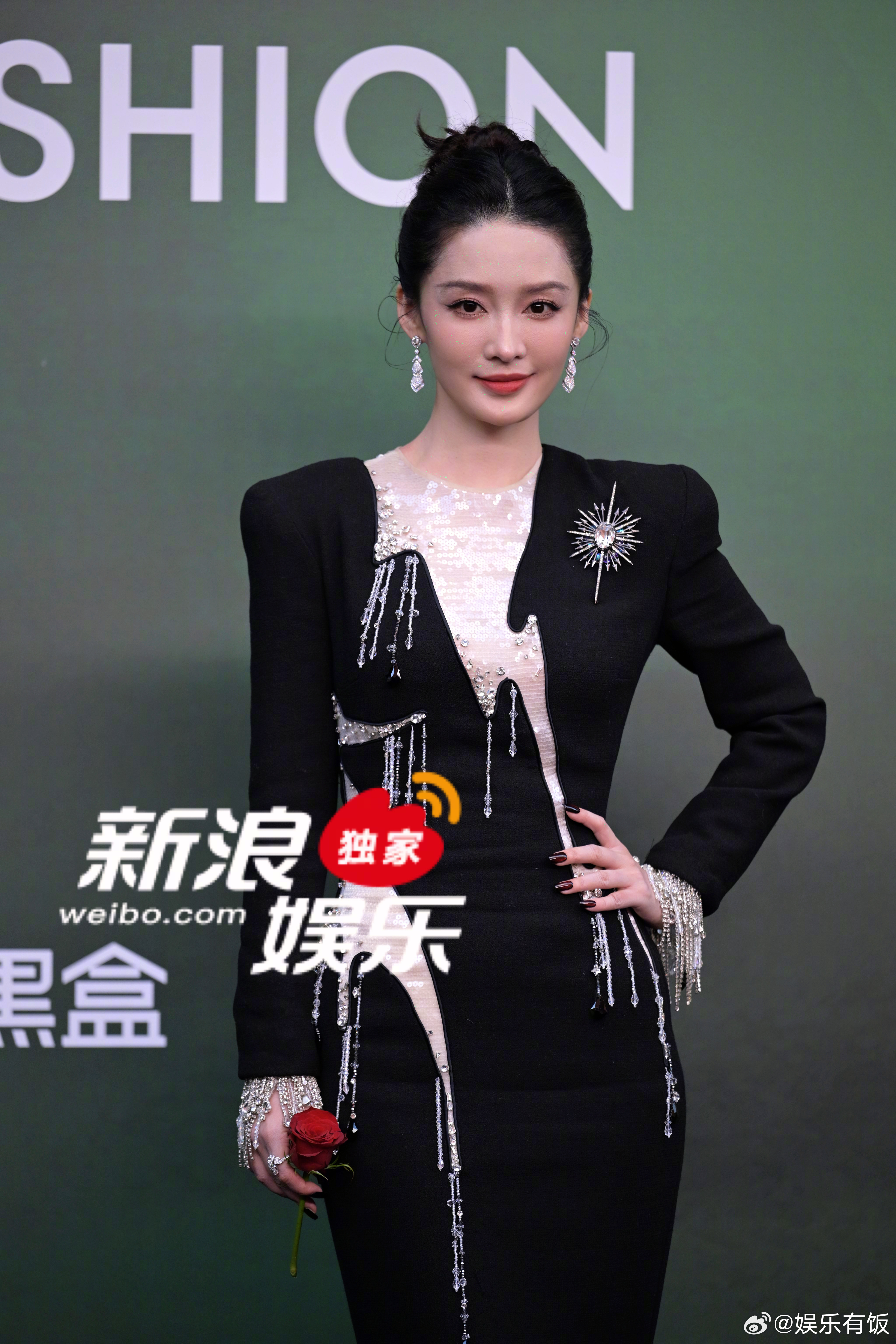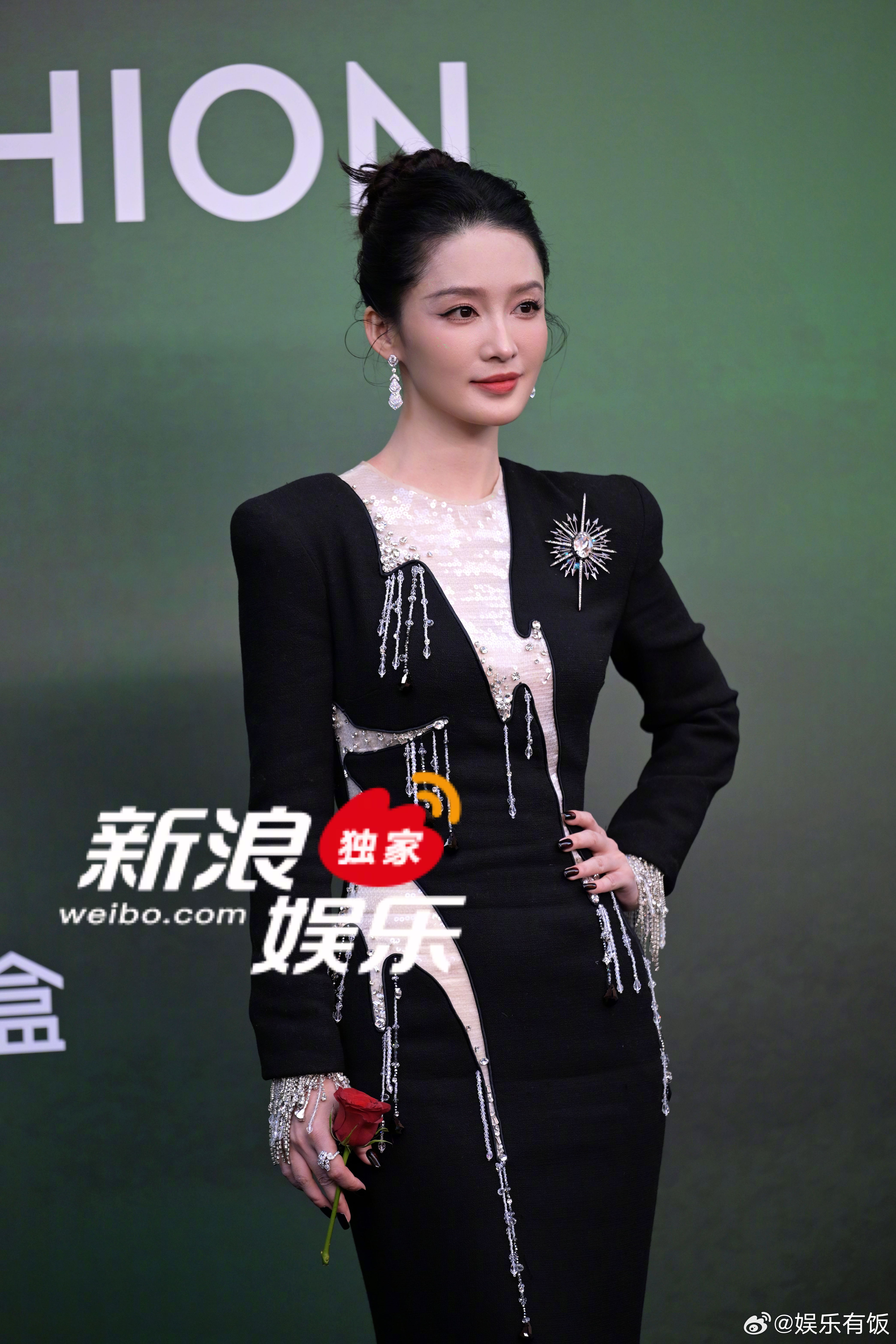 李沁帅成老公了李沁带着玫瑰花走红毯亮相vogue红毯,黑色礼服的沁沁太帅了~